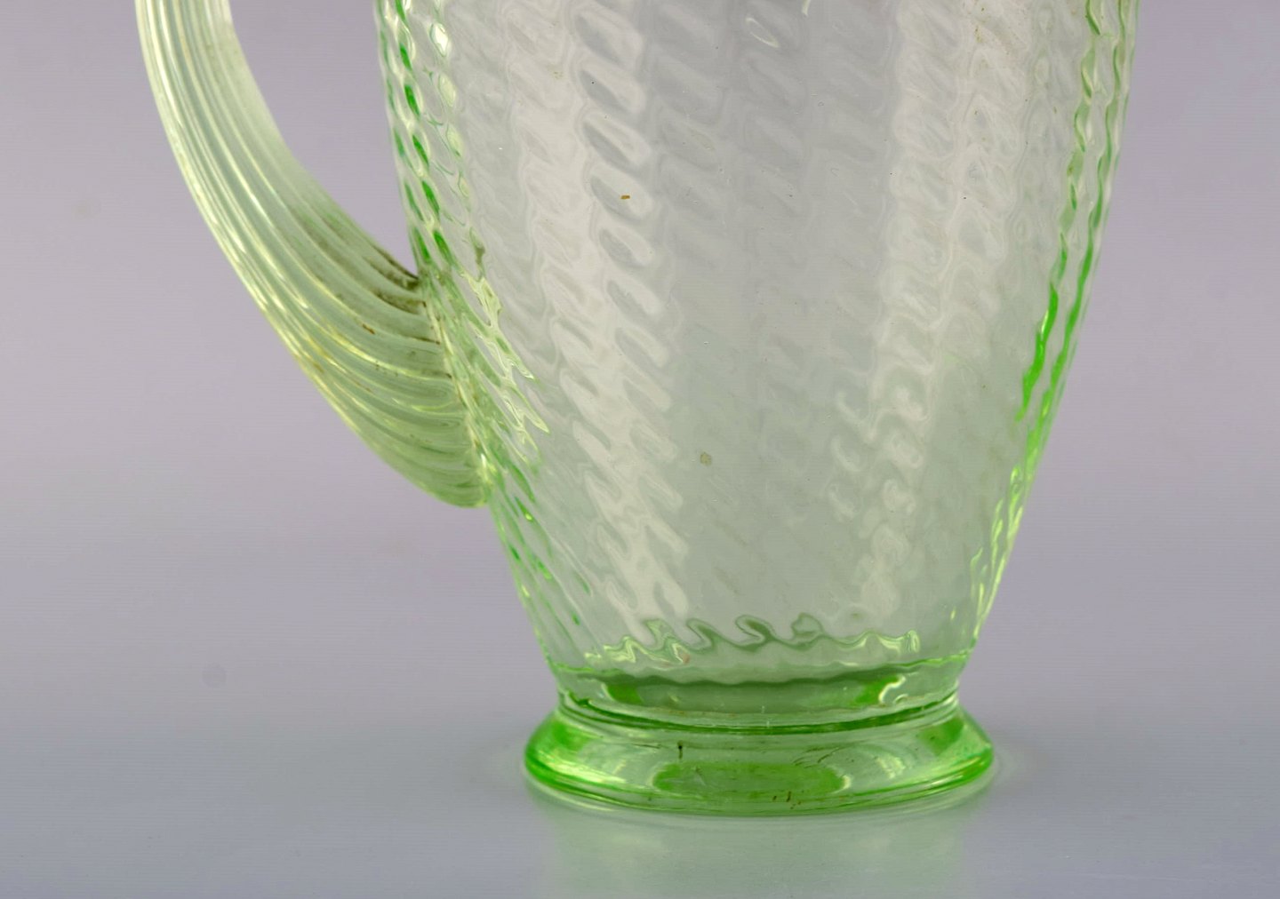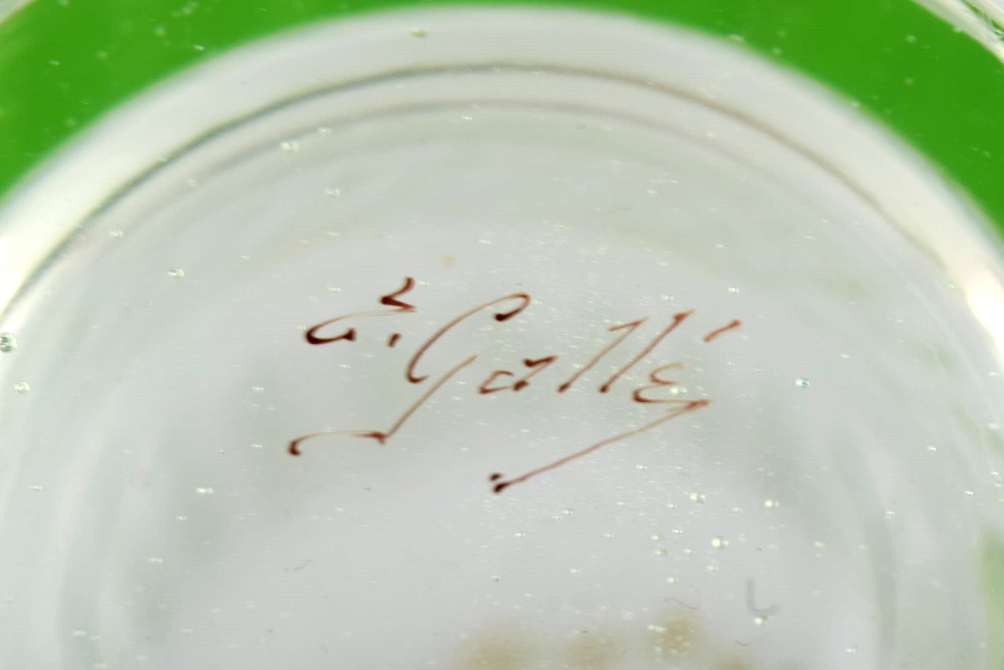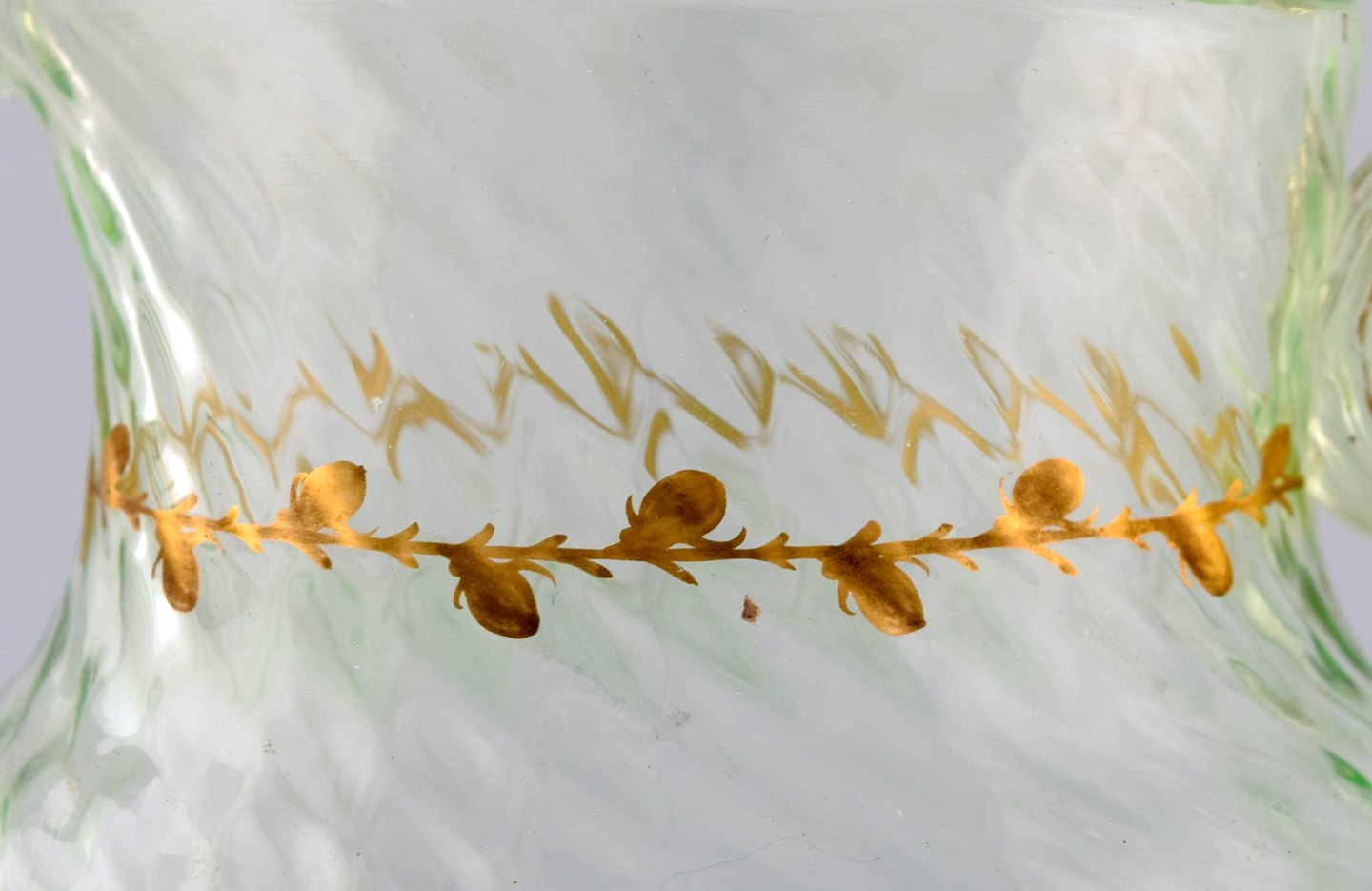 Emile Gallé (1846-1904). Tidlig og sjælden kande i mundblæst lysegrønt kunstglas med håndmalede guldekorationer i form af blade. Museumskvalitet, 1870/80'erne.