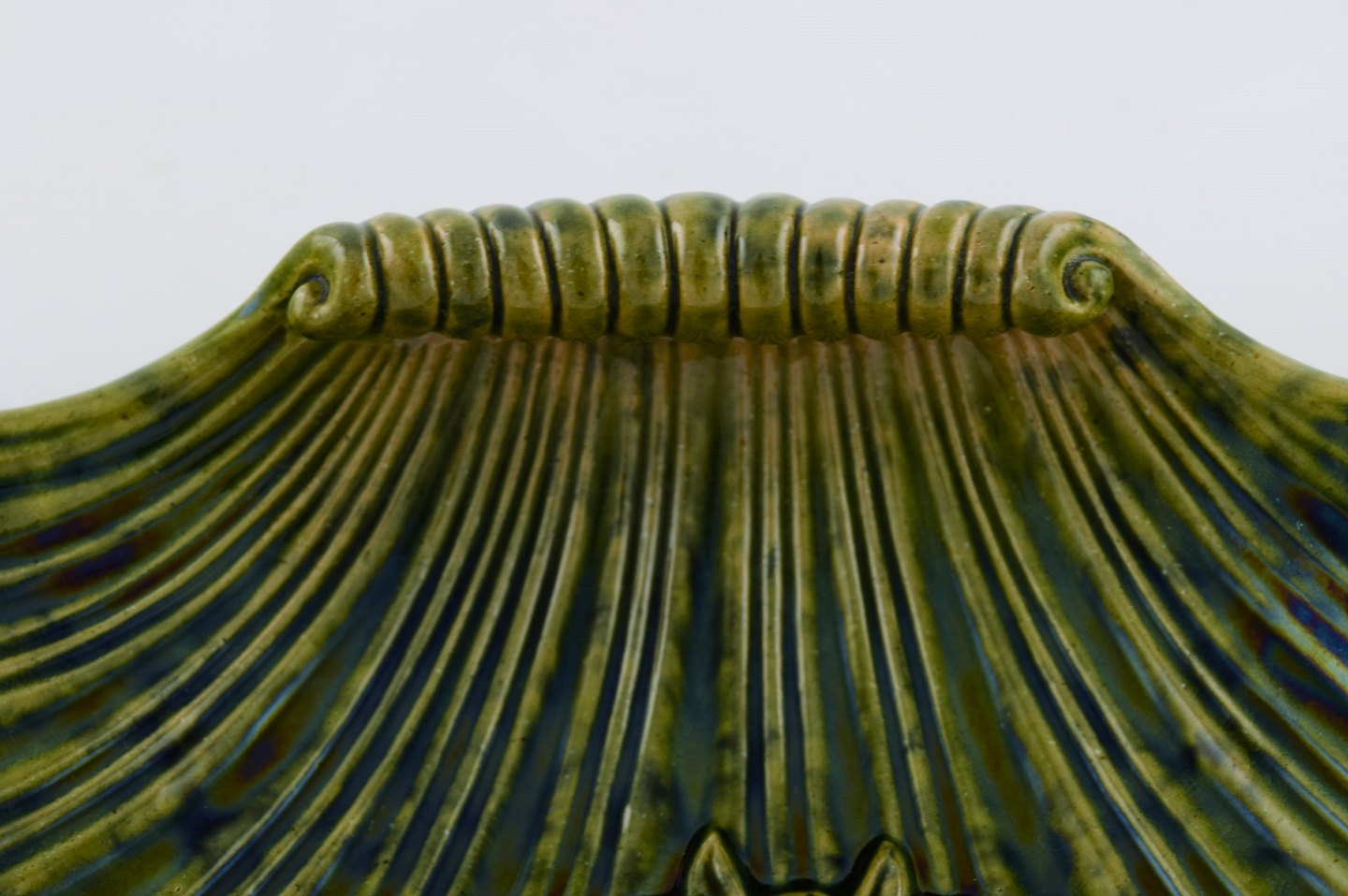 Muslingeformet Höganäs art nouveau fad i glaseret keramik. Smuk efterårsglasur i grønne nuancer. Tidligt 1900-tallet. Måler: 23 x 5,5 cm. I flot stand. Stemplet.