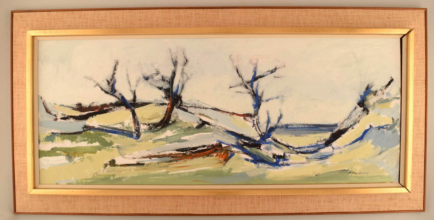 Torgny Forsberg (1920-1992), svensk kunstmaler. Olie på plade. Modernistisk landskab. 1960/70'erne. Pladen måler: 84 x 34 cm. Rammen måler: 8 cm. I flot stand. Signeret.