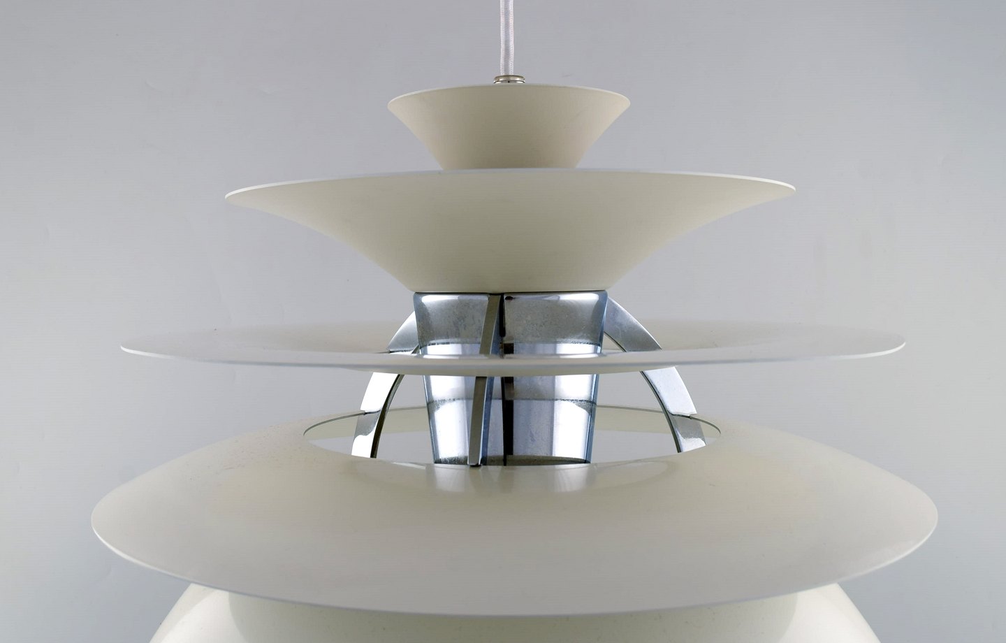 Poul Henningsen for Louis Poulsen. Stor Snowball loftspendel. Stel med otte skærme af hvidlakeret metal. Designet i 1958. Måler: 40 x 39 cm. I flot stand Mærkat. Ltteratur: PH-lampens historie, s. 270-71.