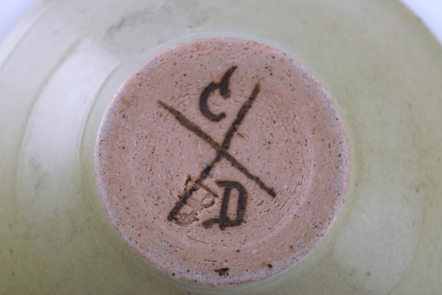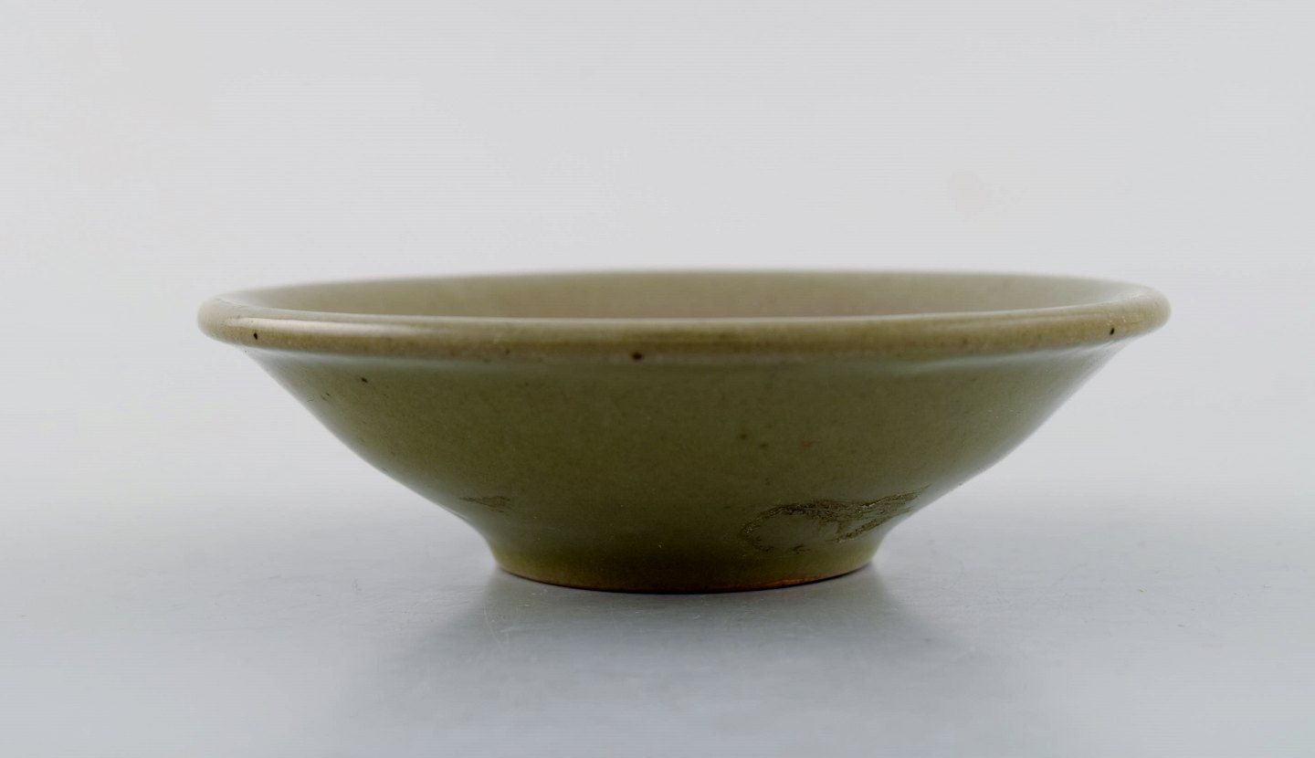 Hjorth (Bornholm). Skål i glaseret keramik. Smuk olivengrøn glasur. Midt 1900-tallet. Måler: 10 x 3 cm. I flot stand. Stemplet.