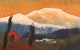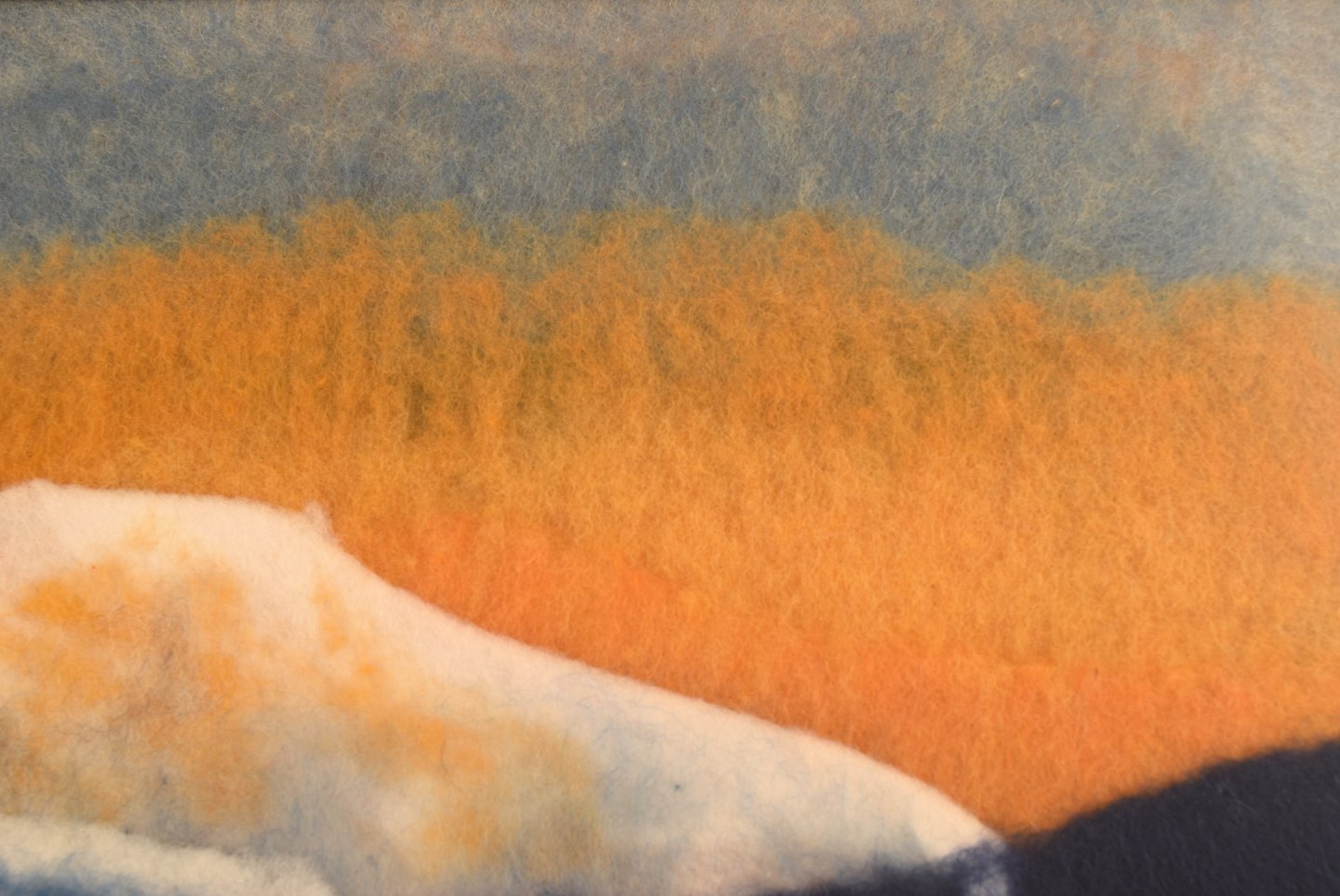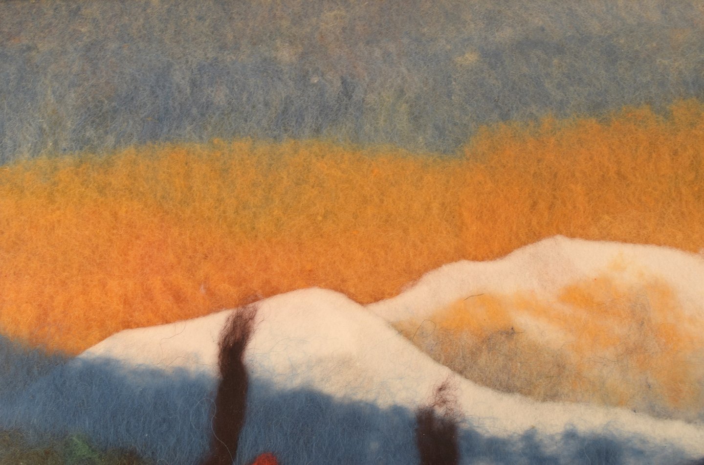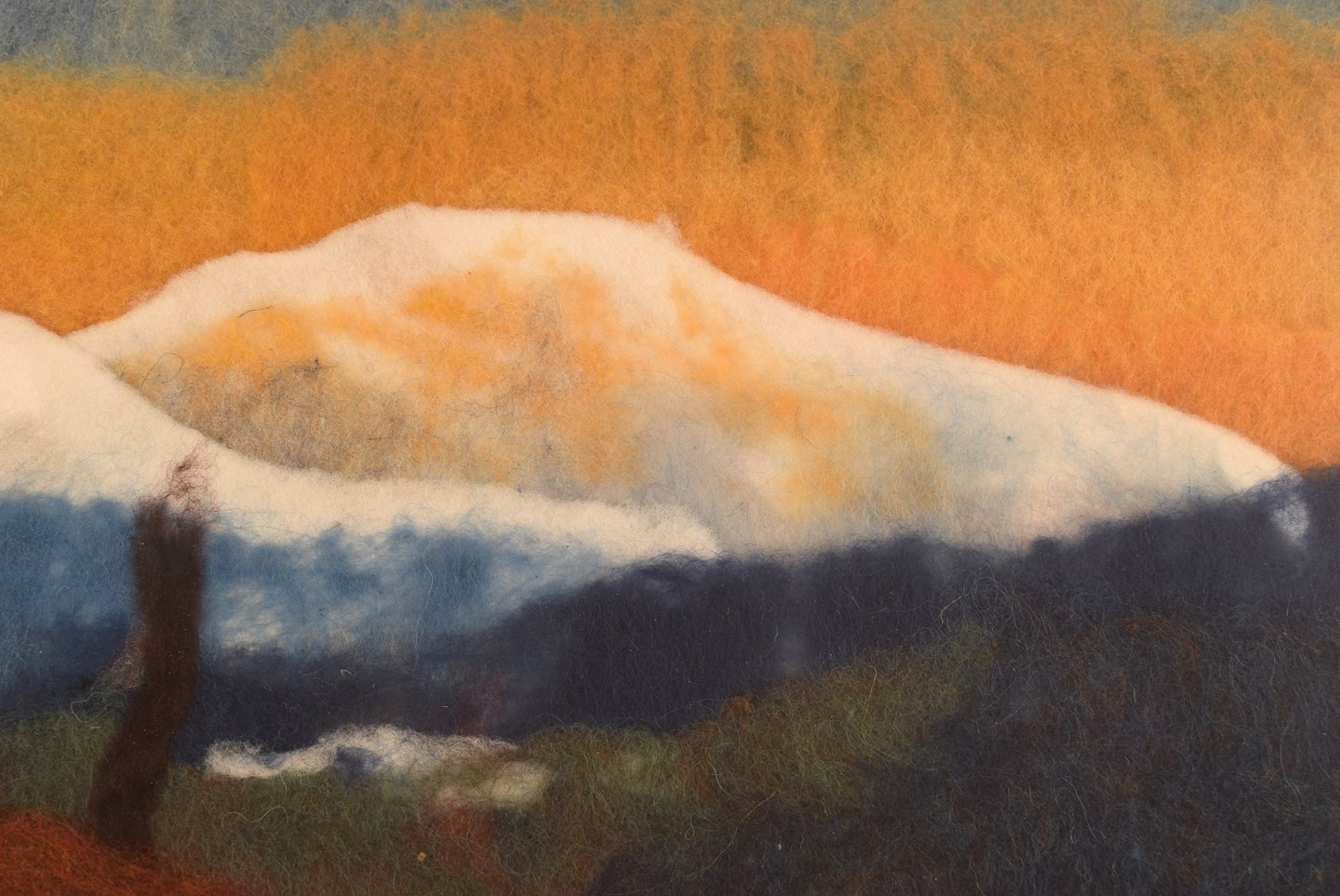 Lisa Johansson, svensk kunstner. Uld på plade. Modernistisk bjerglandskab med hytte. Sent 1900-tallet. Pladen måler: 66 x 33 cm. rammen måler: 6,5 cm. Signeret i monogram. I flot stand.