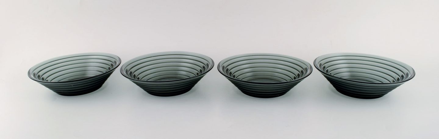 Aino Aalto for Iittala. Fire skåle i blågrønt mundblæst kunstglas. 2000 tallet. Måler: 16 x 4,5 cm. I flot stand. Stemplet.
