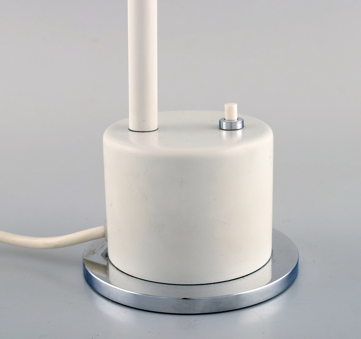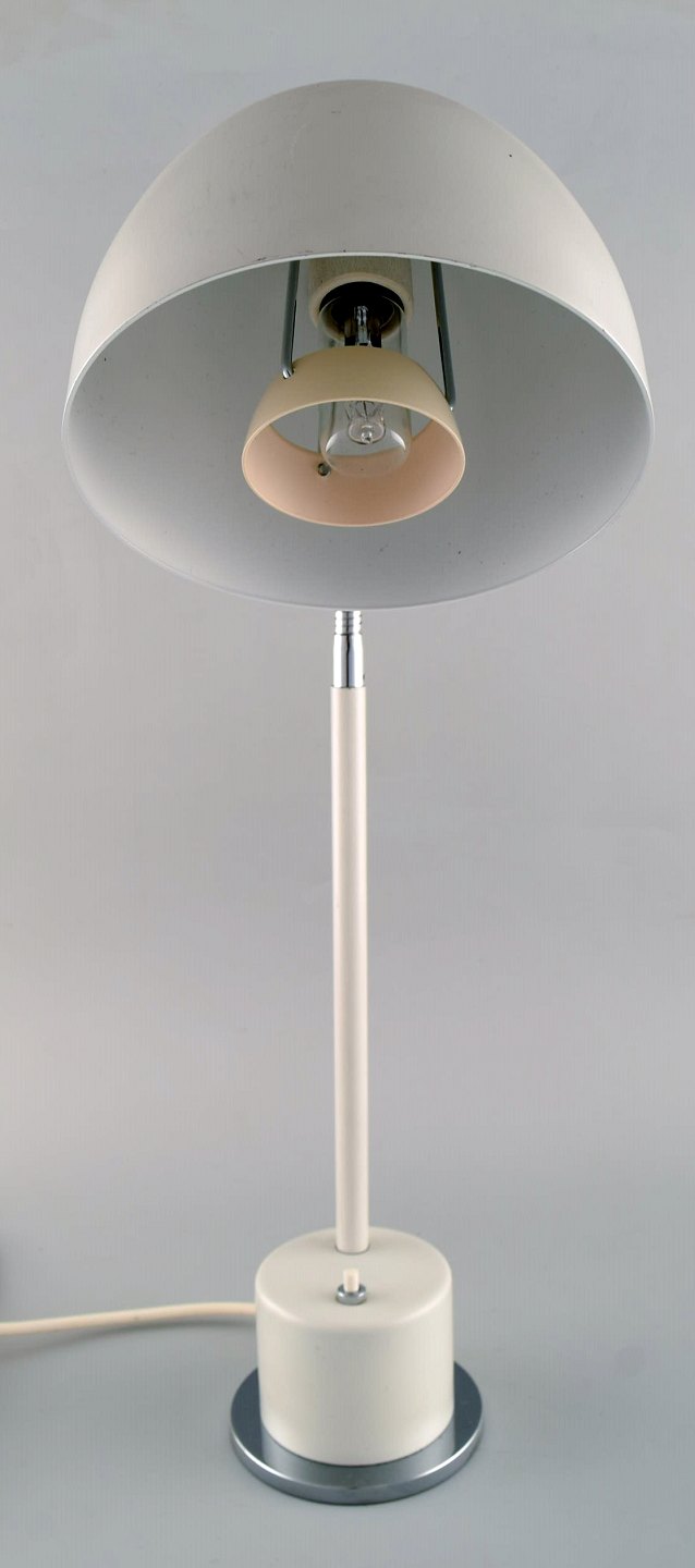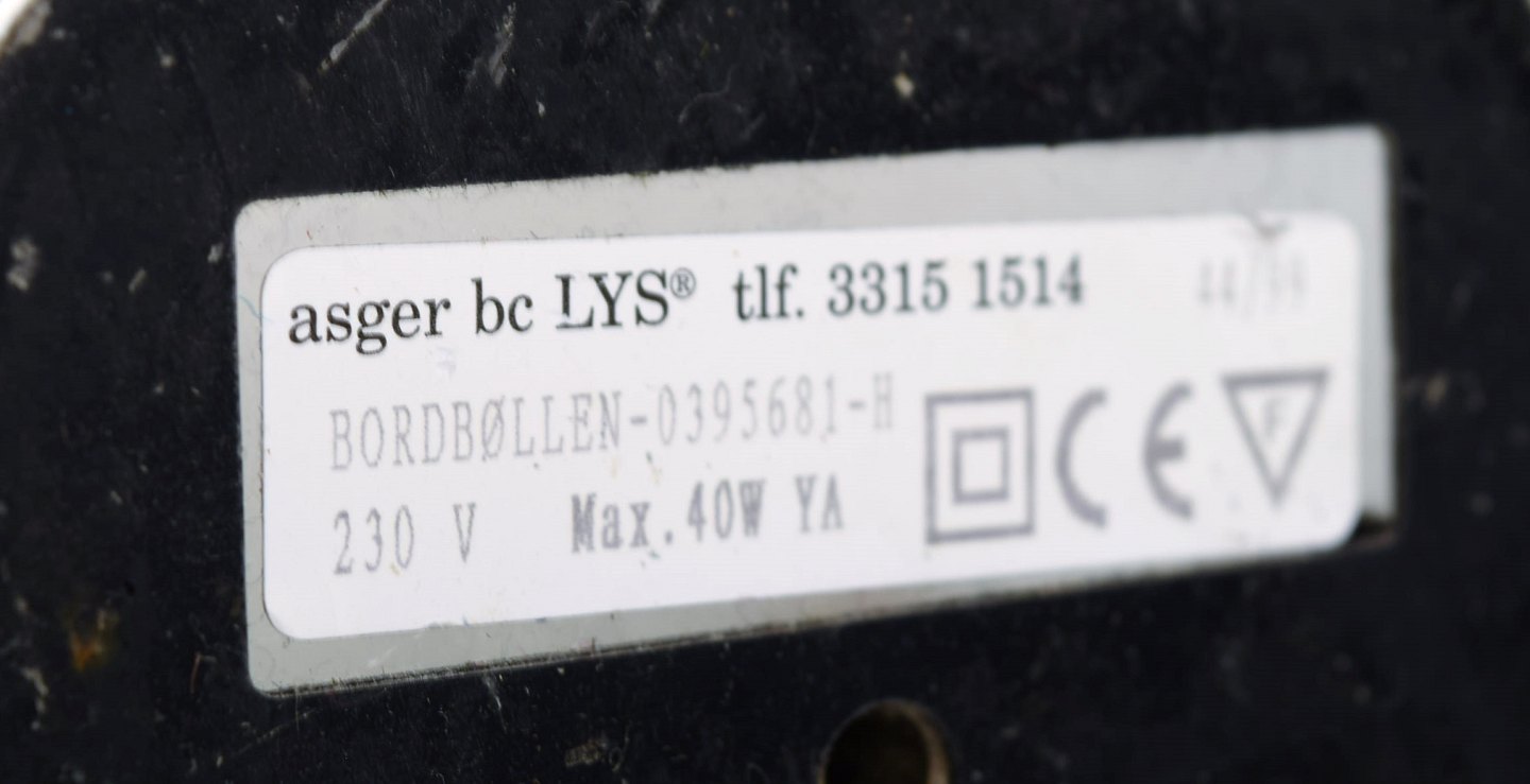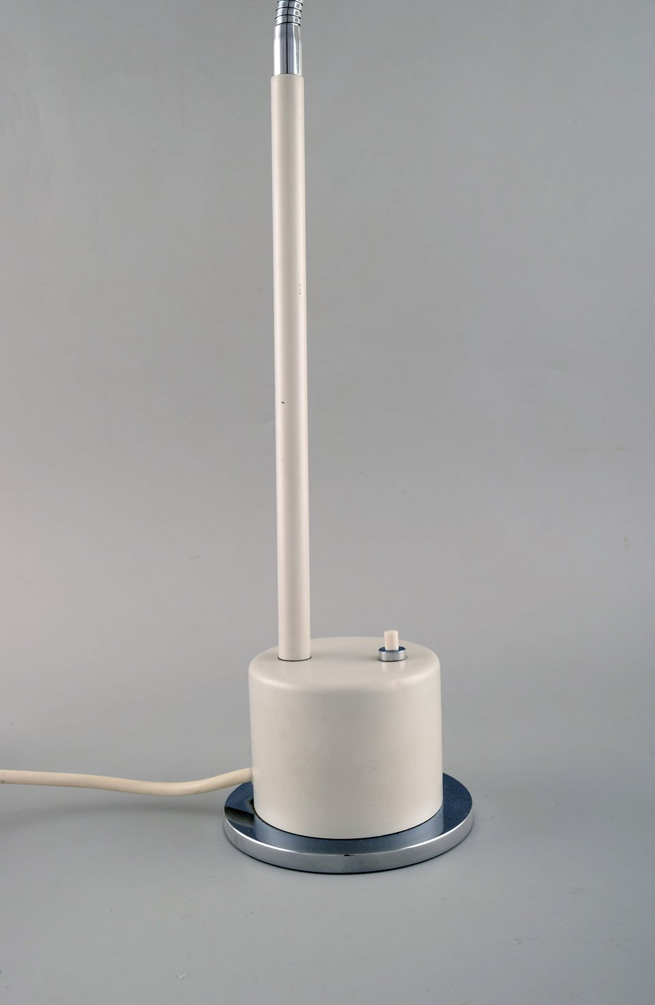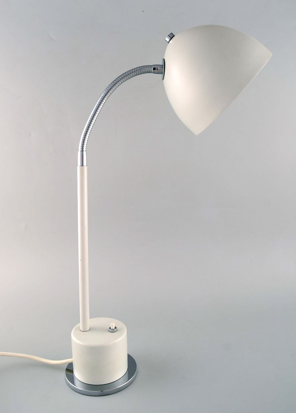 Asger Bay Christiansen. Justerbar bordlampe. Model 'Bordbøllen' af hvidlakeret metal, flexstamme af forkromet metal. Fremstillet hos Asger Bc Lys. Sent 1900-tallet.