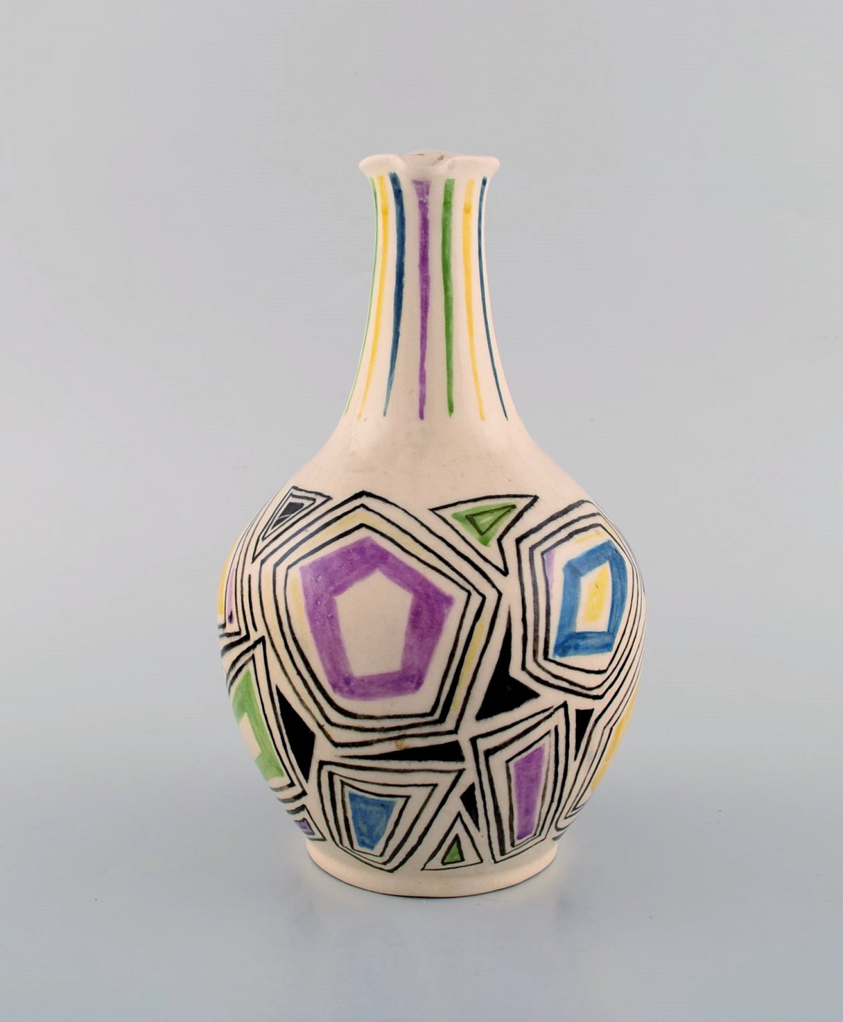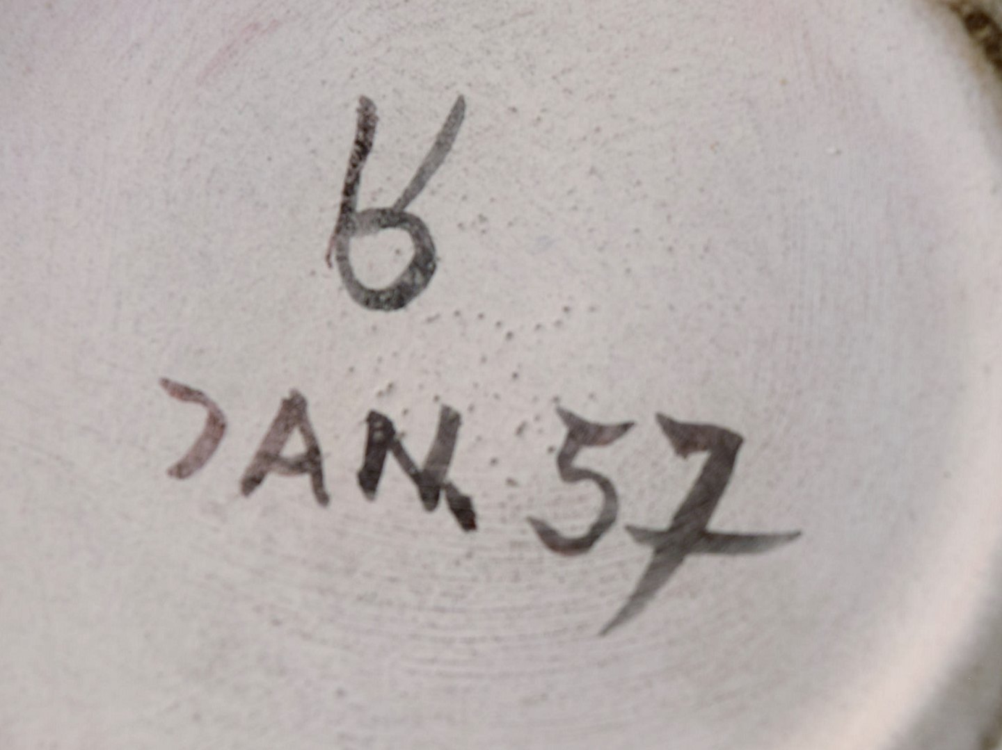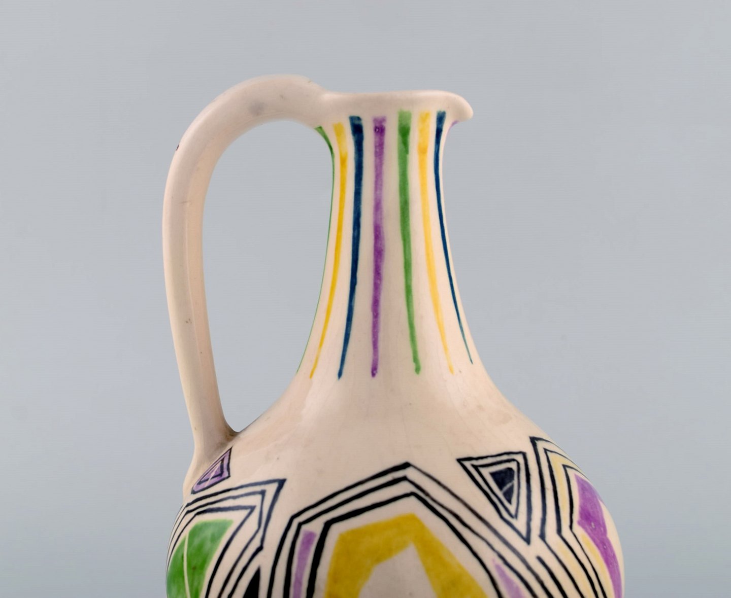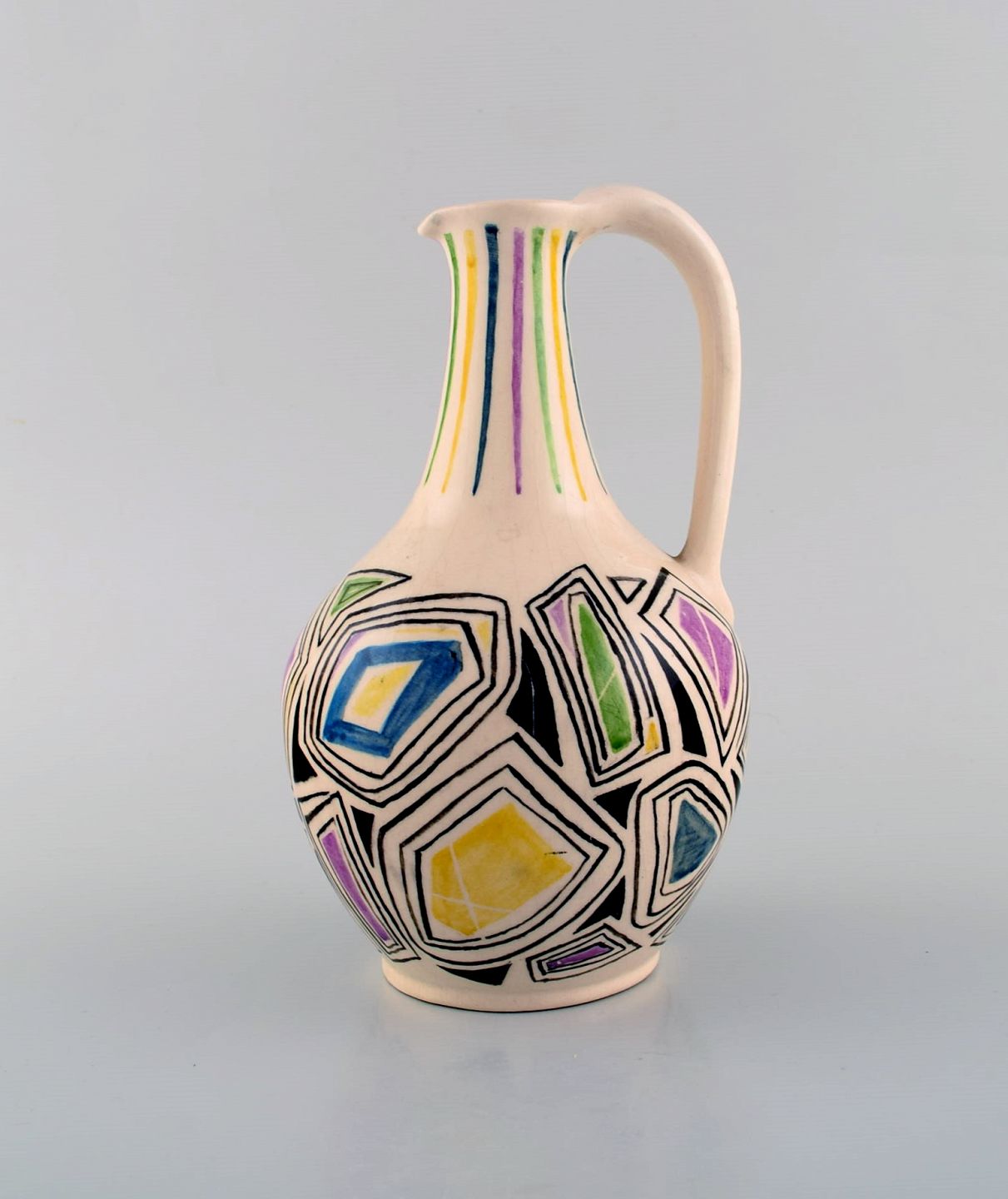 Europæisk studio keramiker. Unika kande med hank i glaseret keramik. Dateret 1957. Måler: 19,5 x 12 cm. I flot stand. Signeret.