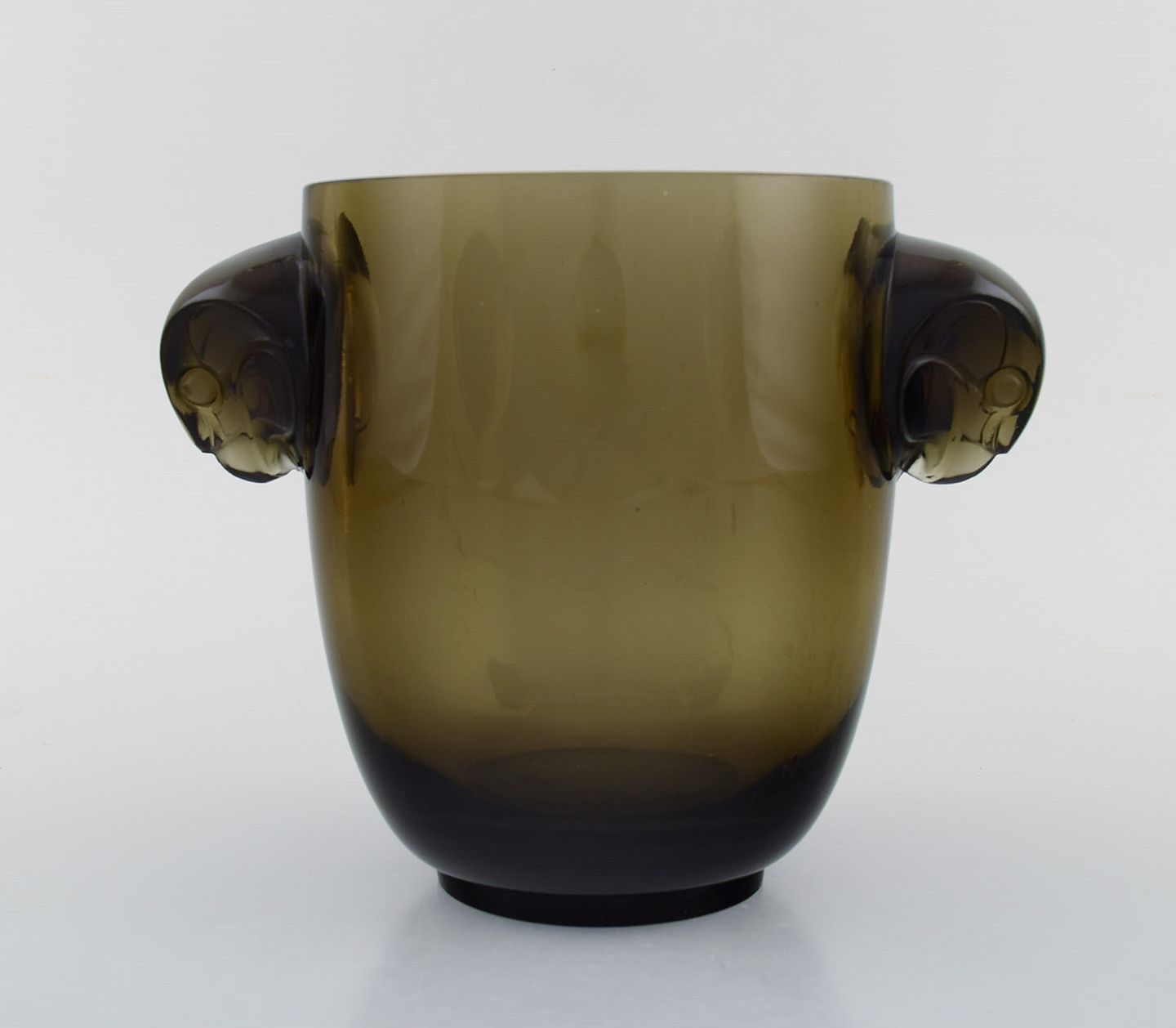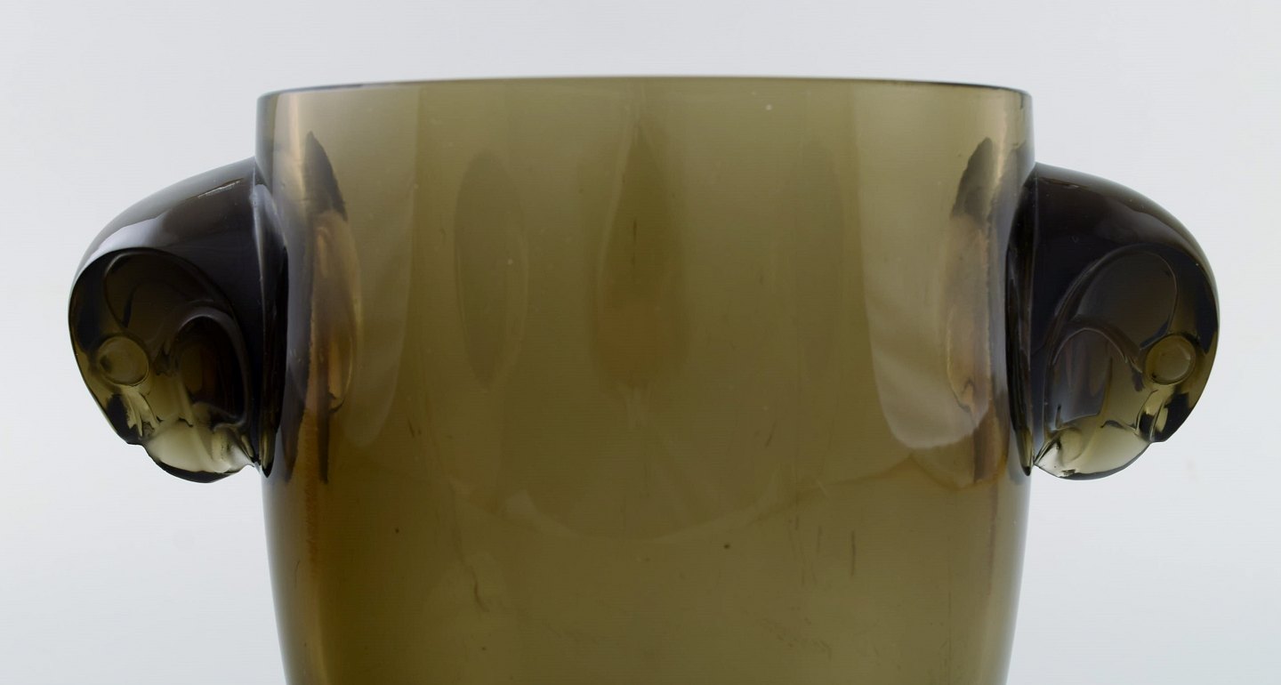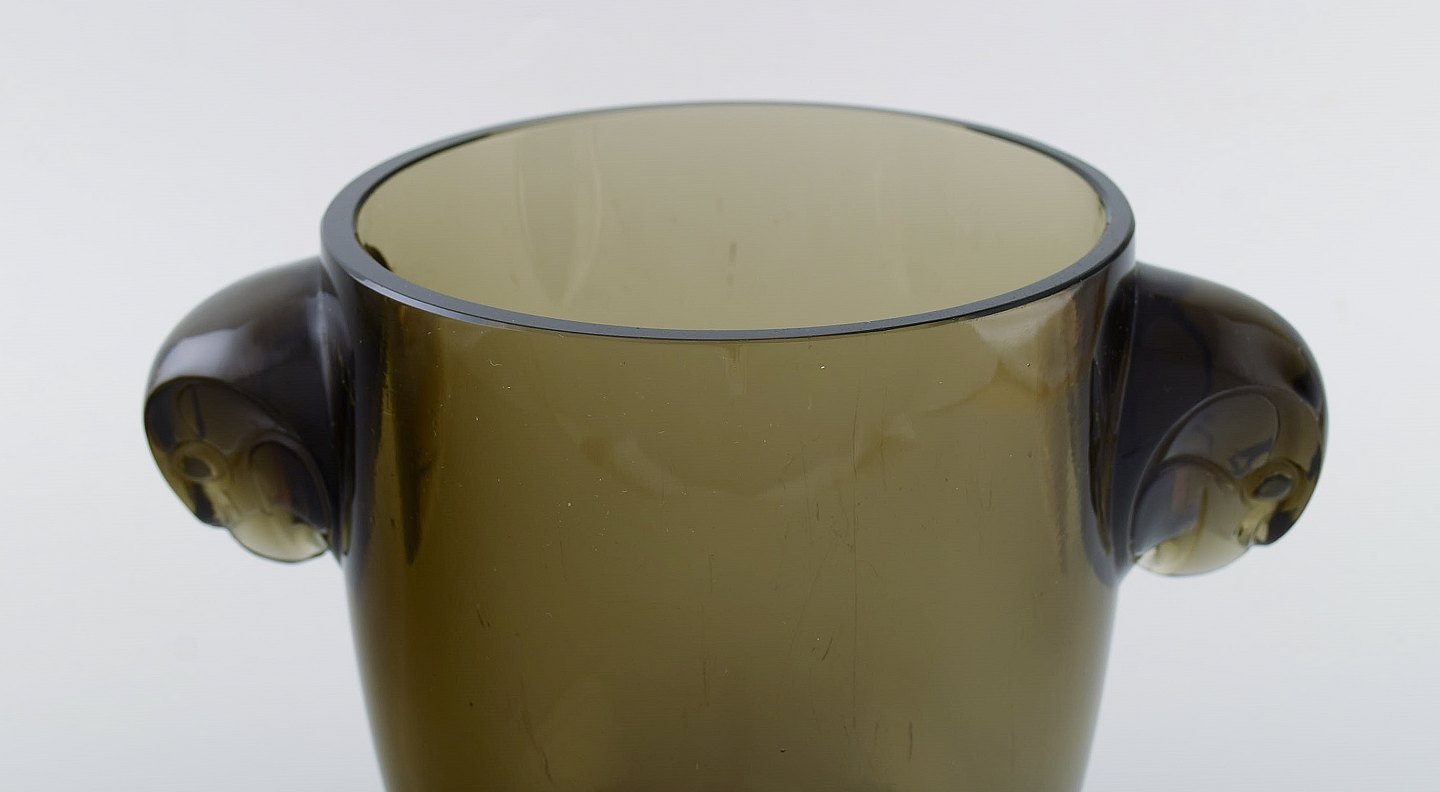Tidlig René Lalique vase i topaz kunstglas med høge. Model 958. Ca 1925. Måler: 22 x 17,5 cm. I flot stand. Signeret.