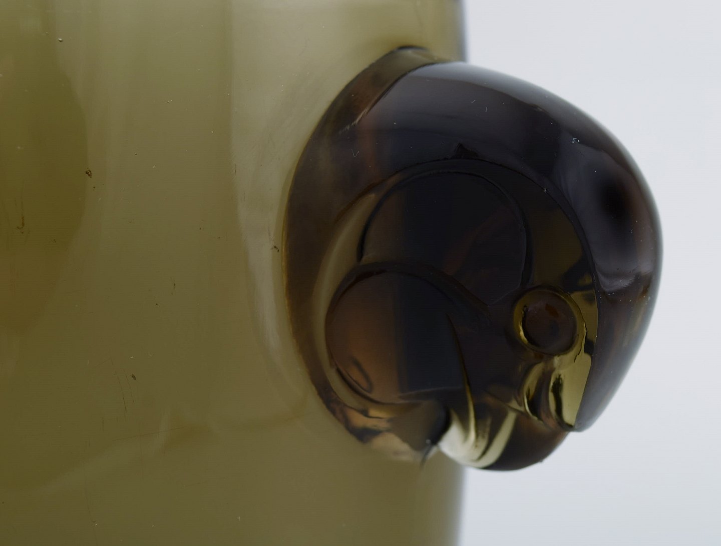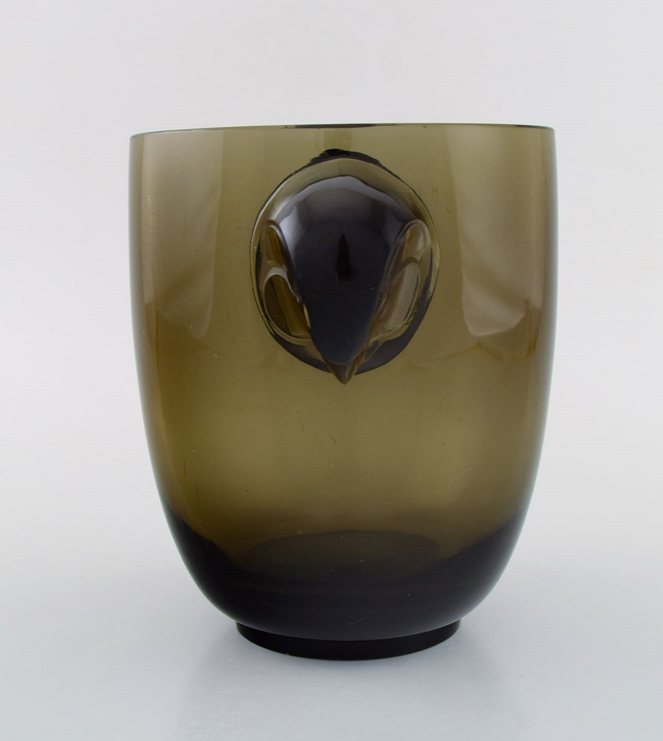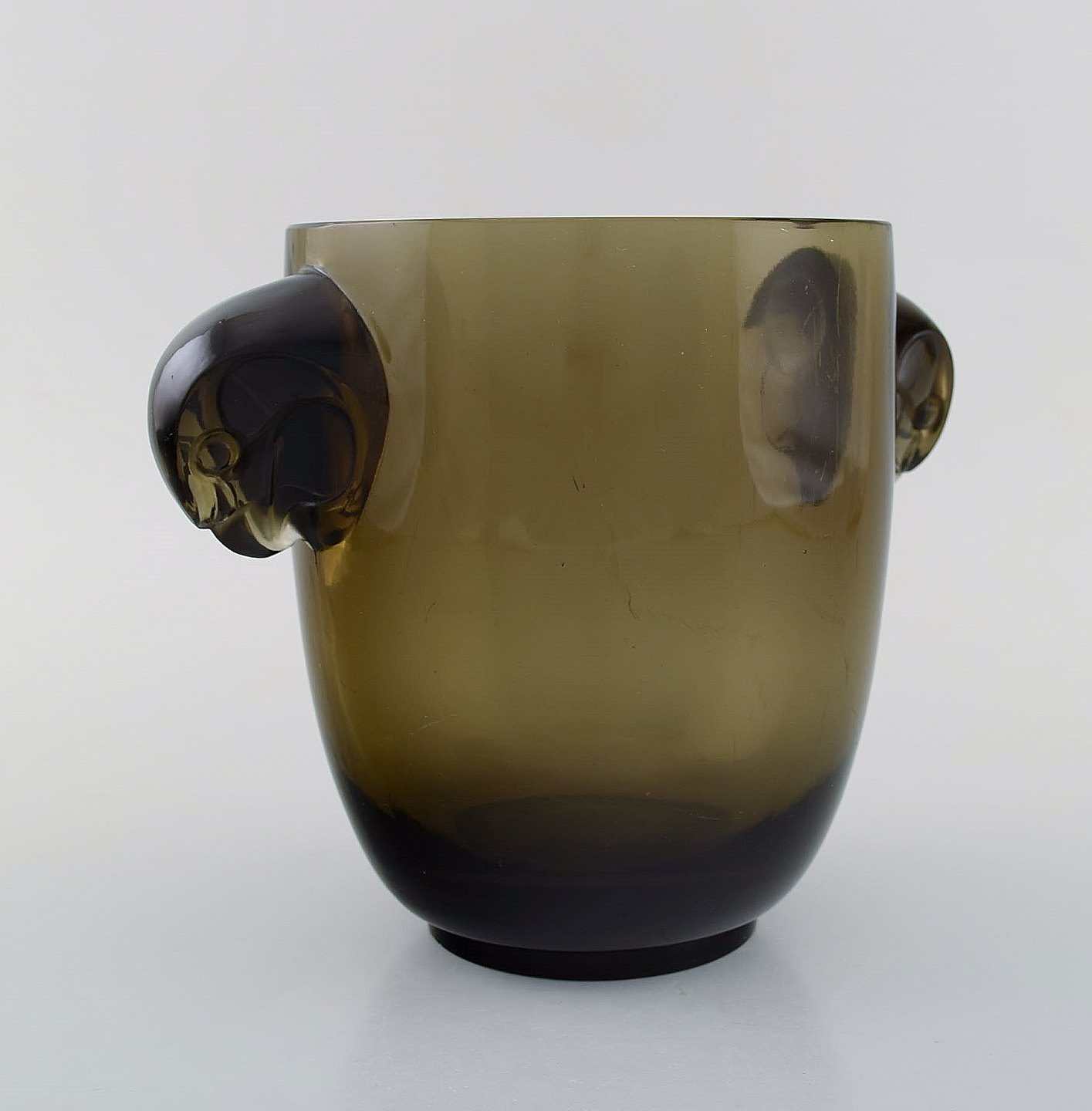 Tidlig René Lalique vase i topaz kunstglas med høge. Model 958. Ca 1925. Måler: 22 x 17,5 cm. I flot stand. Signeret.