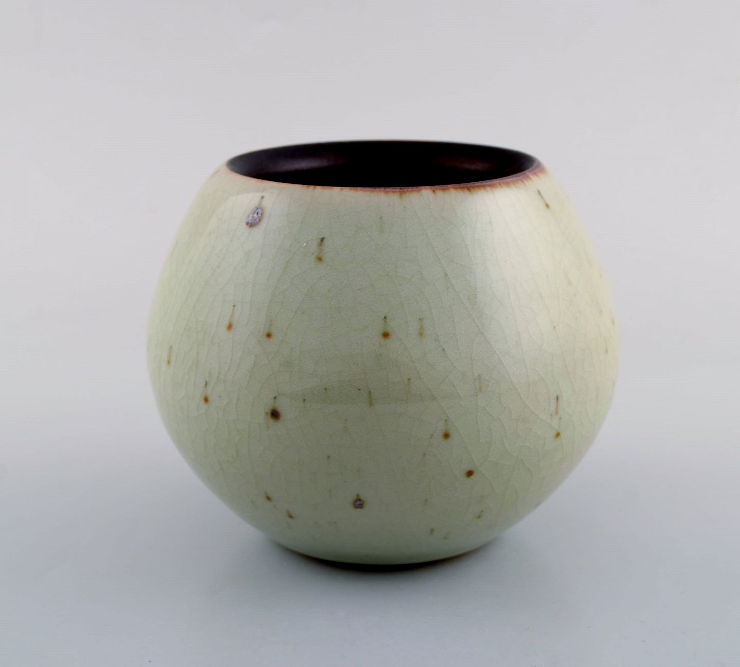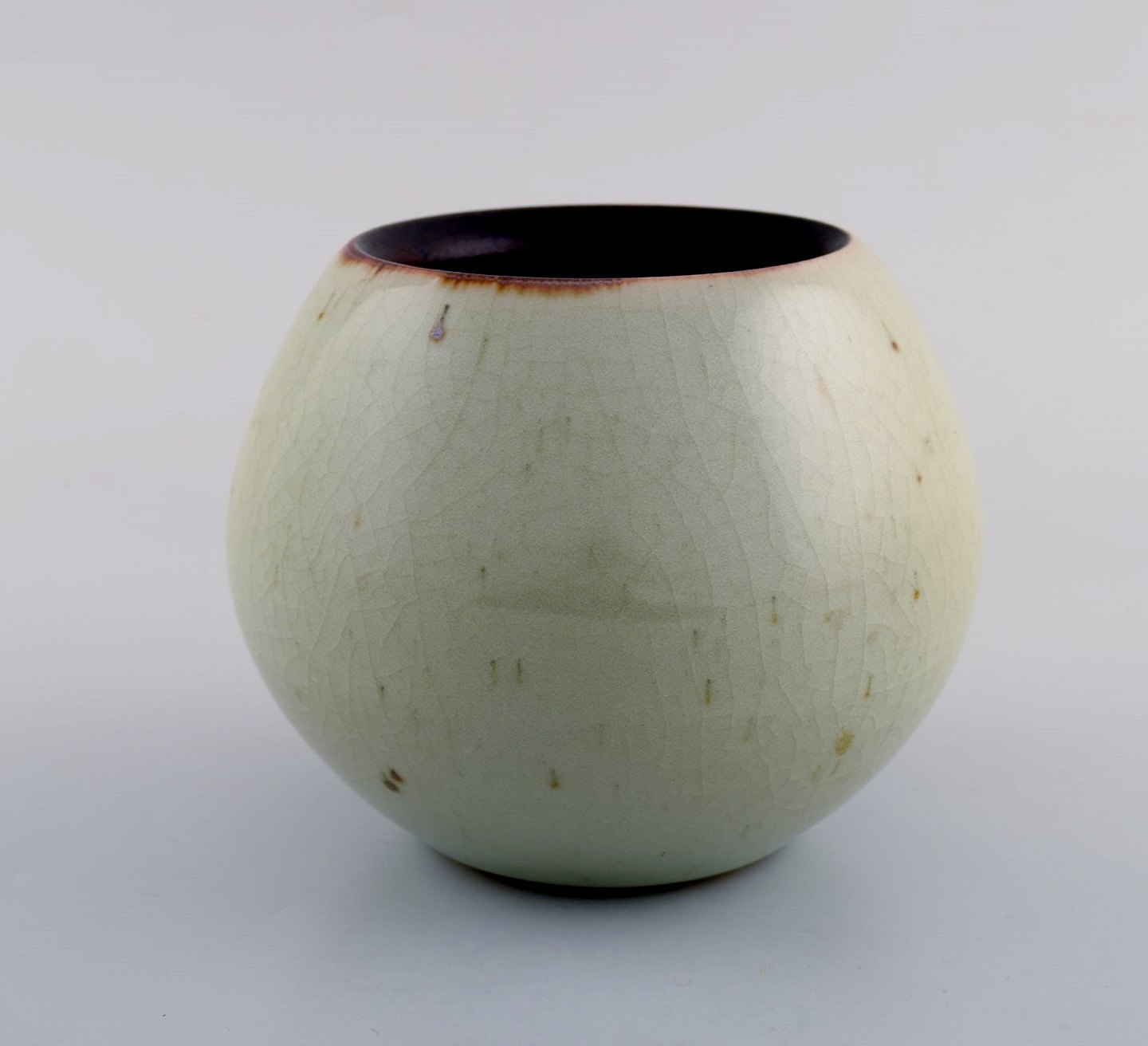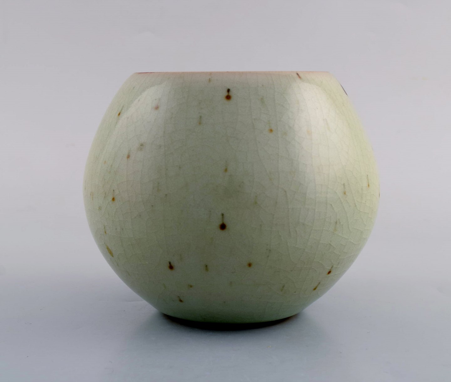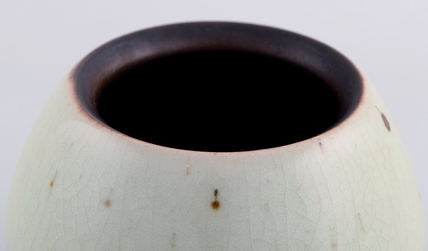 Europæisk studio keramiker. Unika vase i glaseret keramik. Smuk krakkeleret glasur i lyse jordnuancer. 1980'erne. Måler: 14 x 11,2 cm. I flot stand. Signeret.