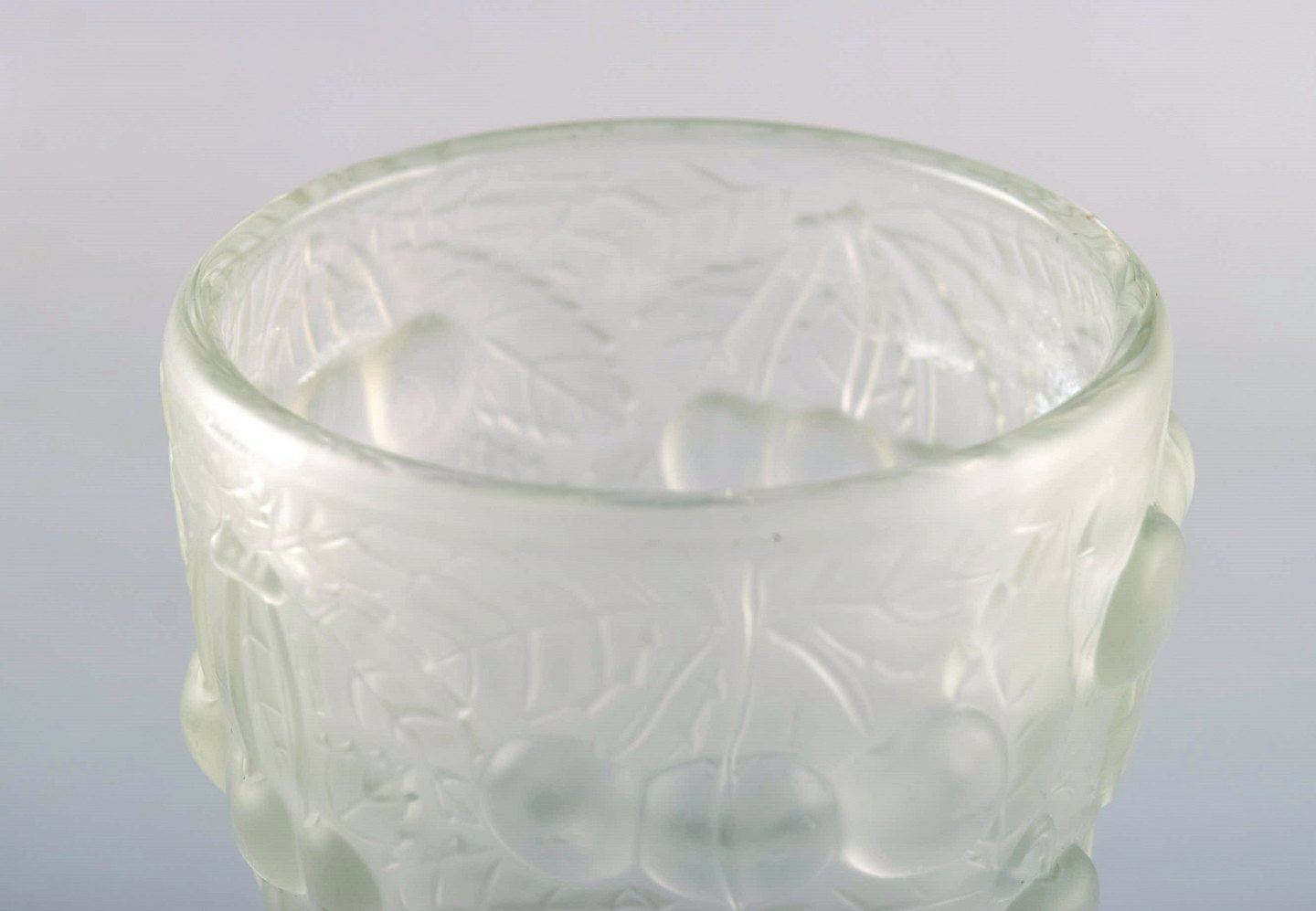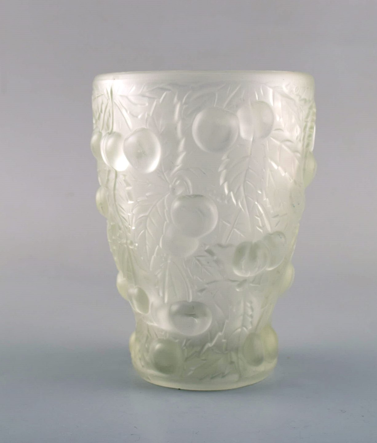 Lalique stil kunstglas vase i klart glas med kirsebær i relief. 1930/40´erne.