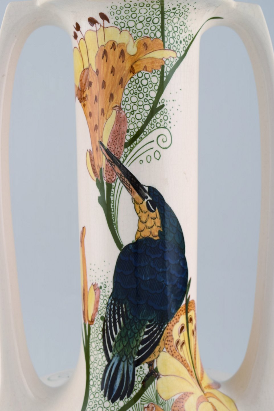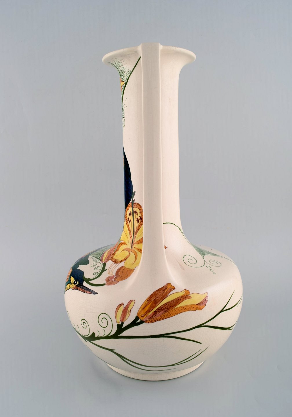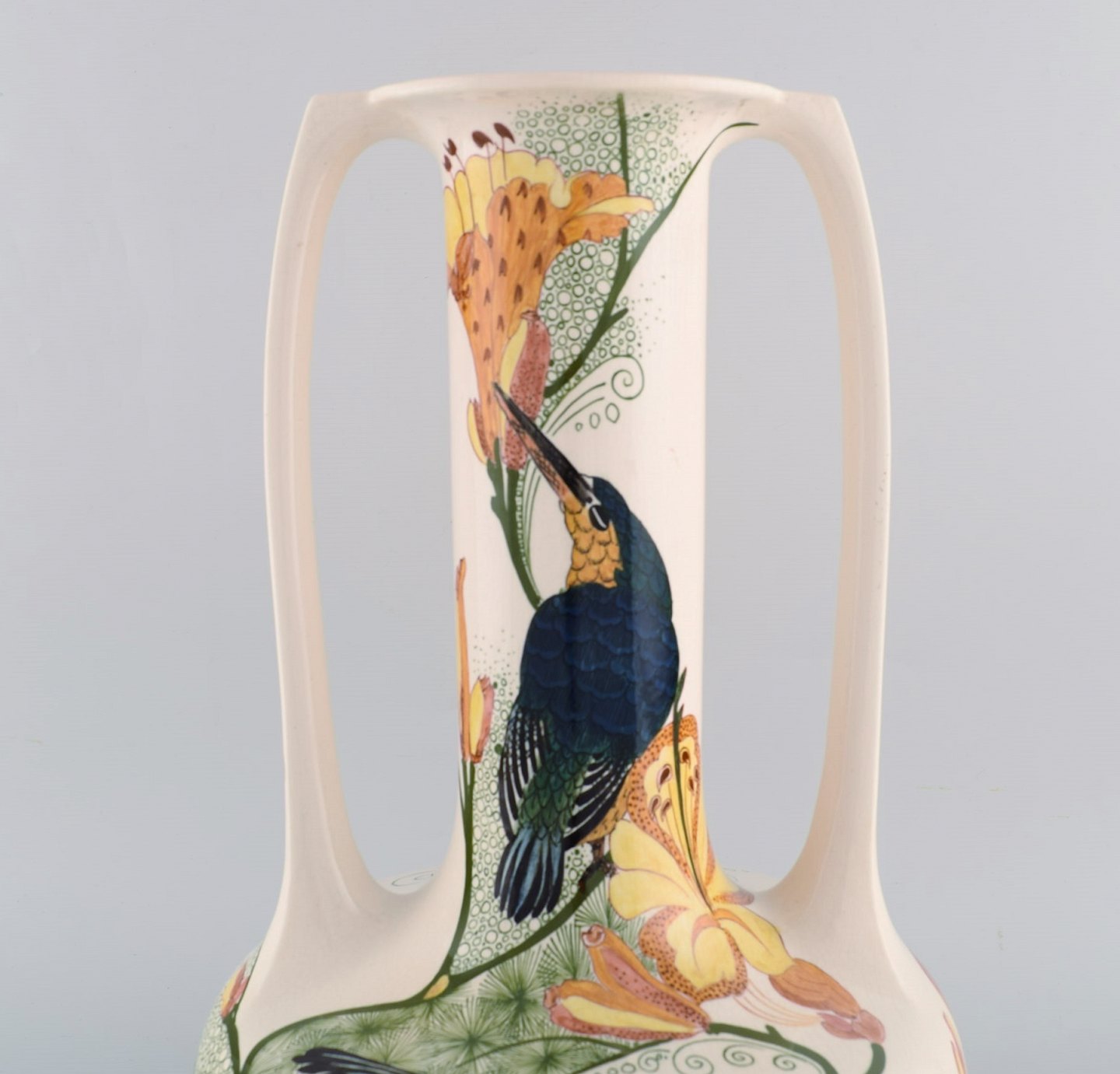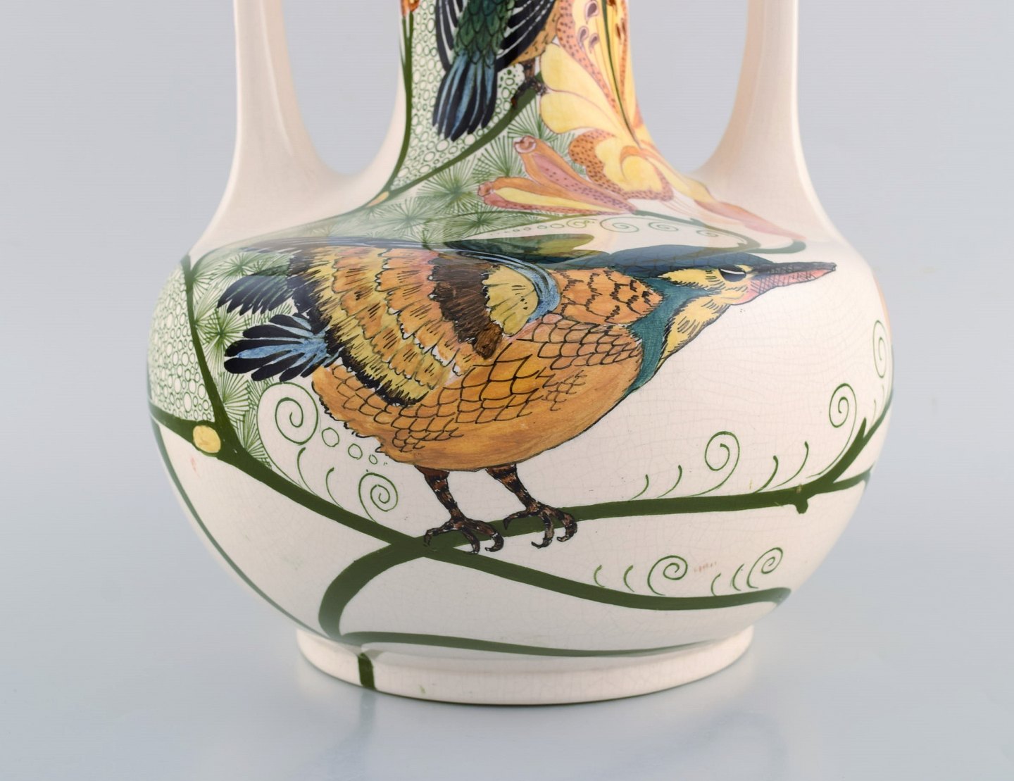 Amphora, Holland. Large art nouveau vase with handles in hand-painted faience with bird motifs. Early 20th century. Measures: 39.5 x 24.5 cm. In very good condition. Signed.