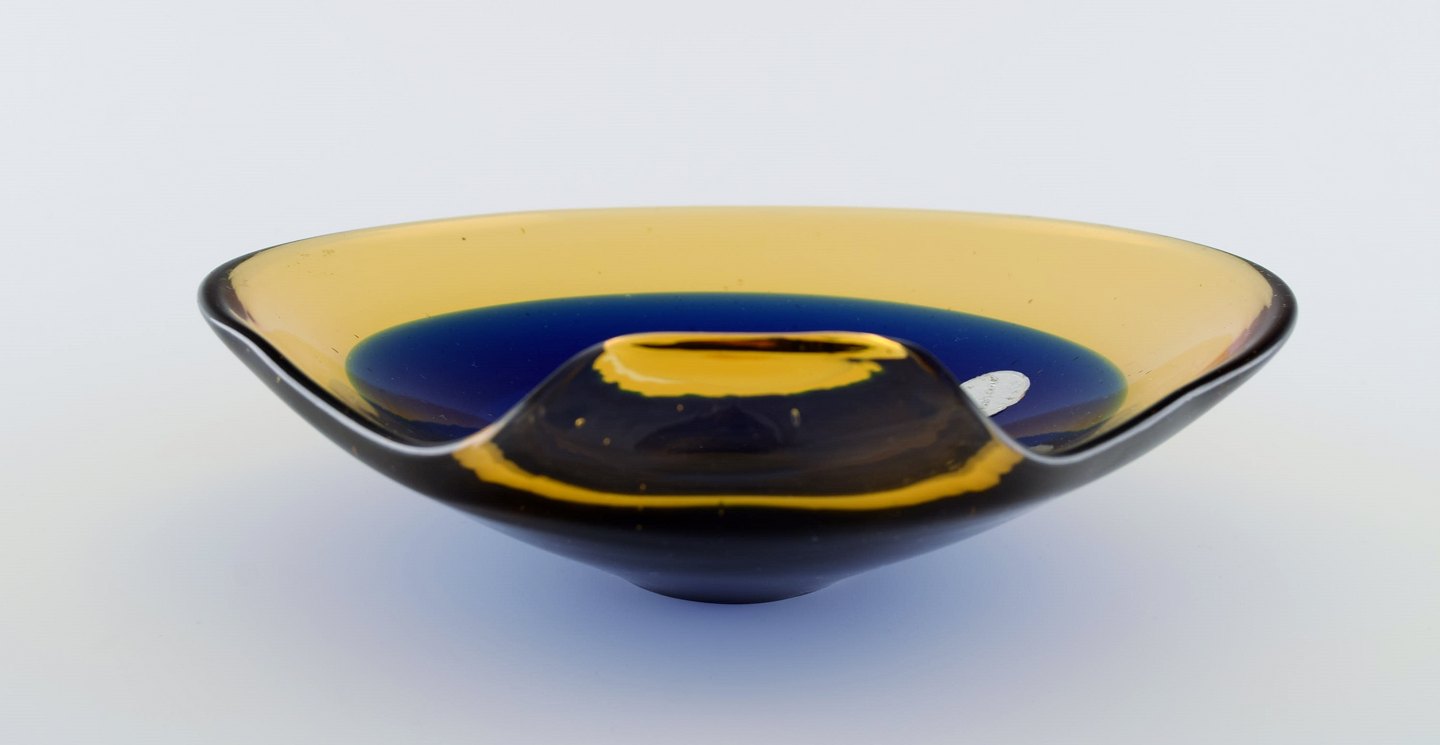 Murano skål i blåt og røgfarvet mundblæst kunstglas. Italiensk design, 1960'erne.