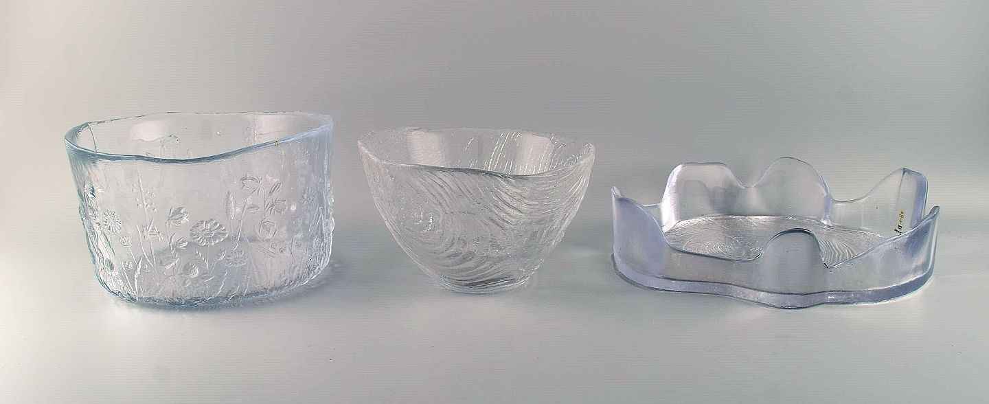 Three large bowls in art glass decorated with flowers and trees. Skruf, Sweden and others. 1980's. Largest measures: 21 x 12 cm. In very good condition.