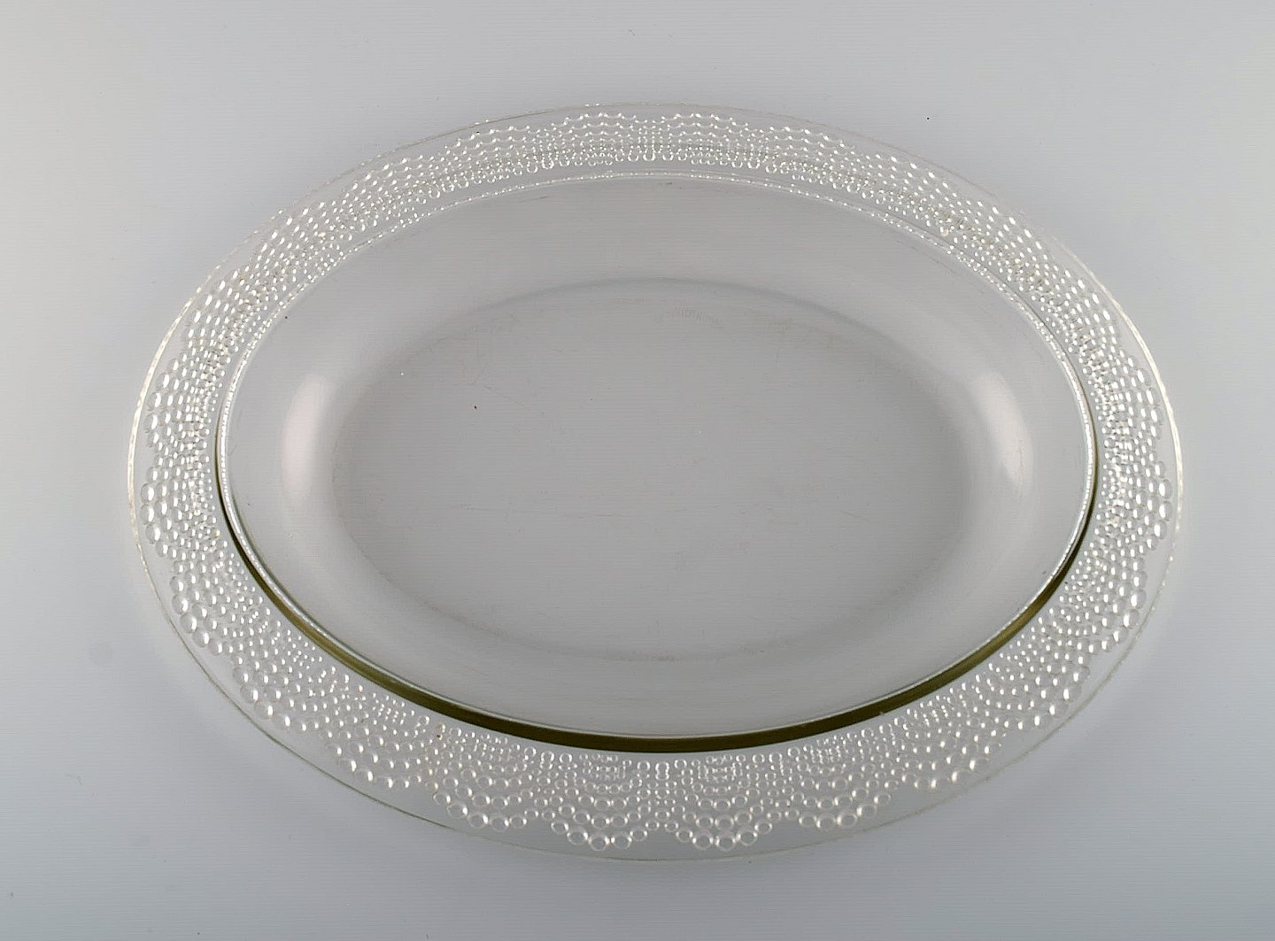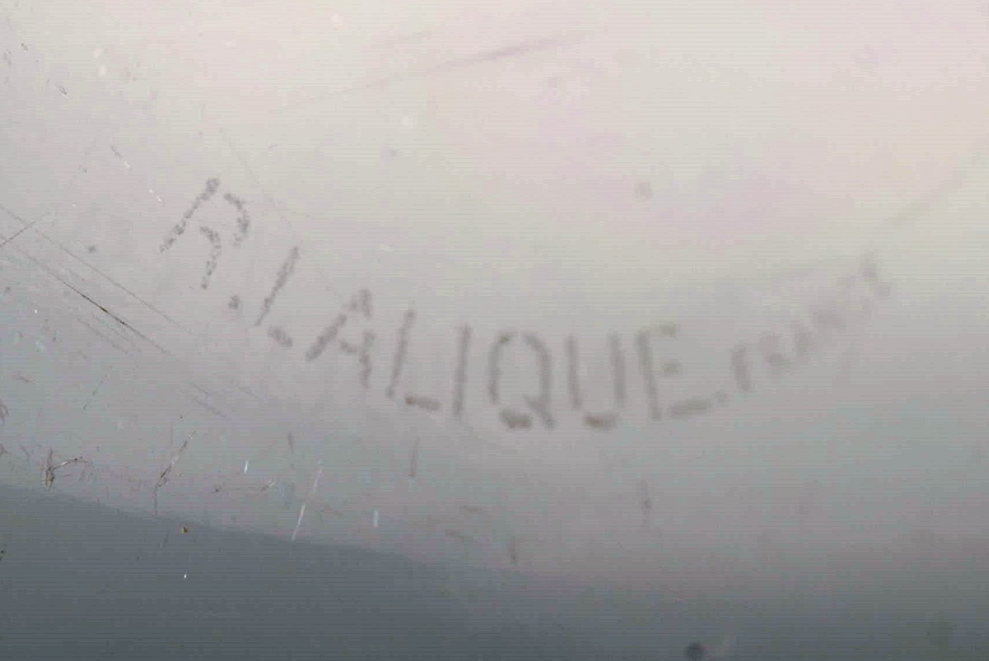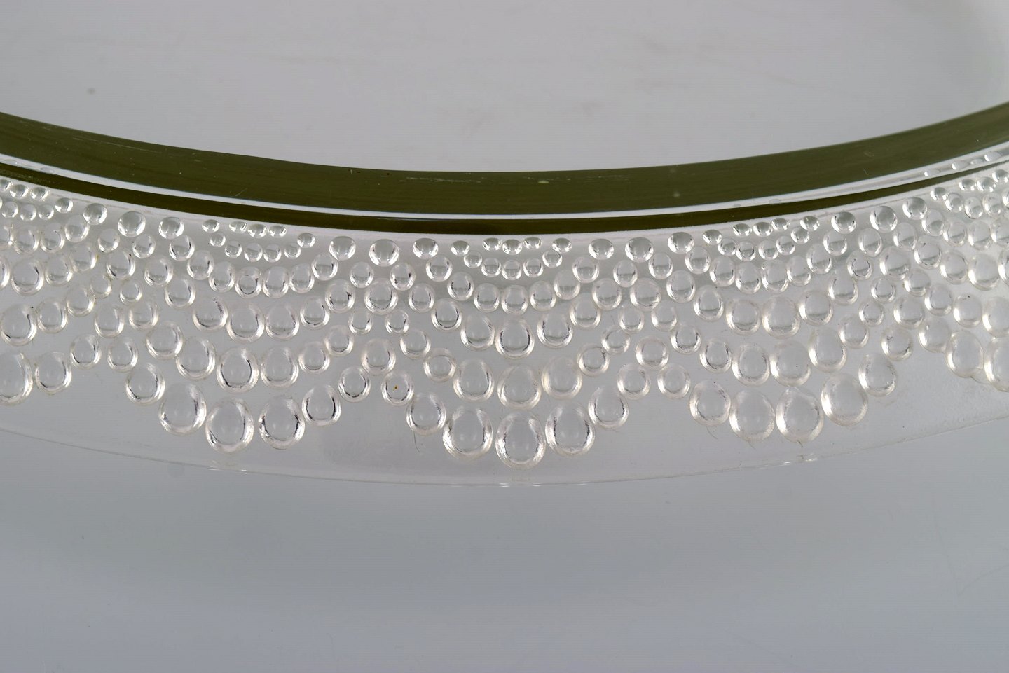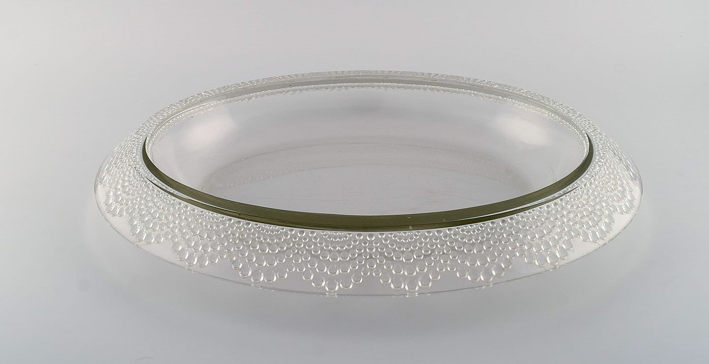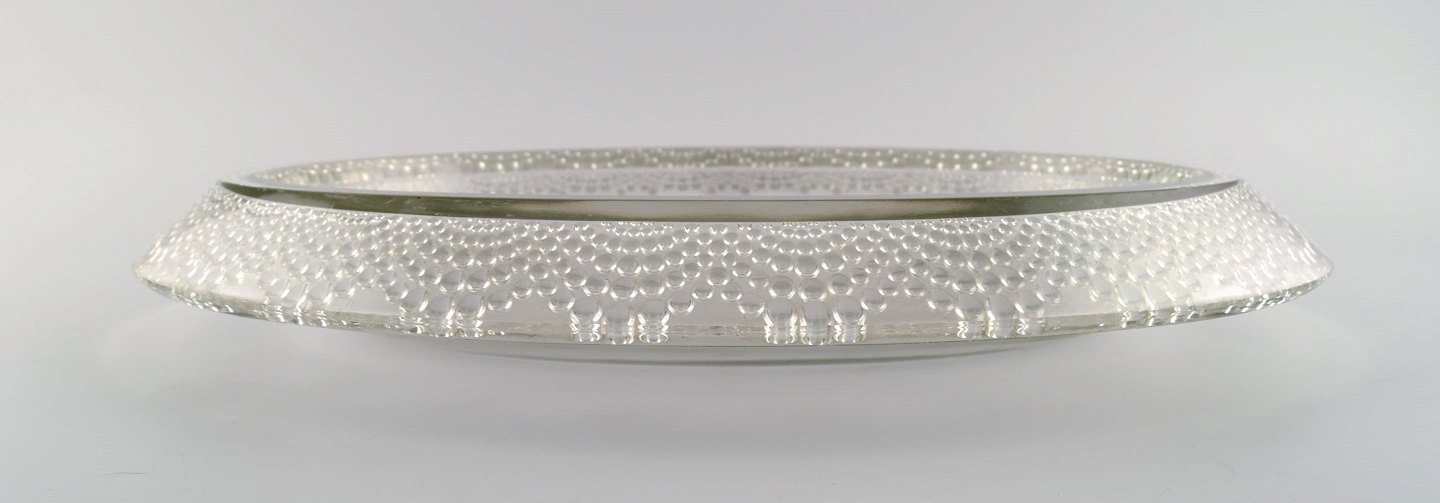 Large early René Lalique Tokyo jardiniere in art glass with molded pearls decoration all around the rim. Ca. 1934. Measures: 42 x 31 x 6 cm. Stamped. In very good condition.