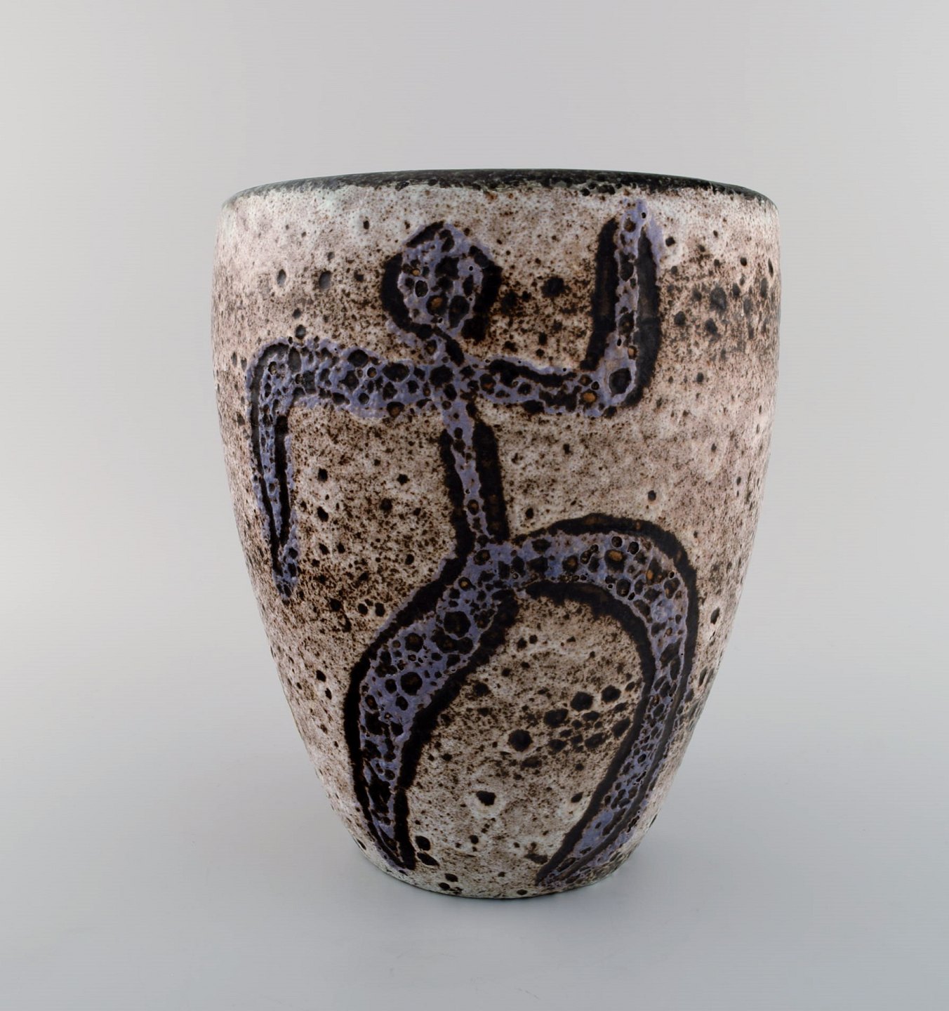 Fransk studio keramiker. Stor vase i glaseret keramik dekoreret med dansere i gul, blå og lilla. Midt 1900-tallet. Måler: 25 x 21 cm. I flot stand. Signeret.
