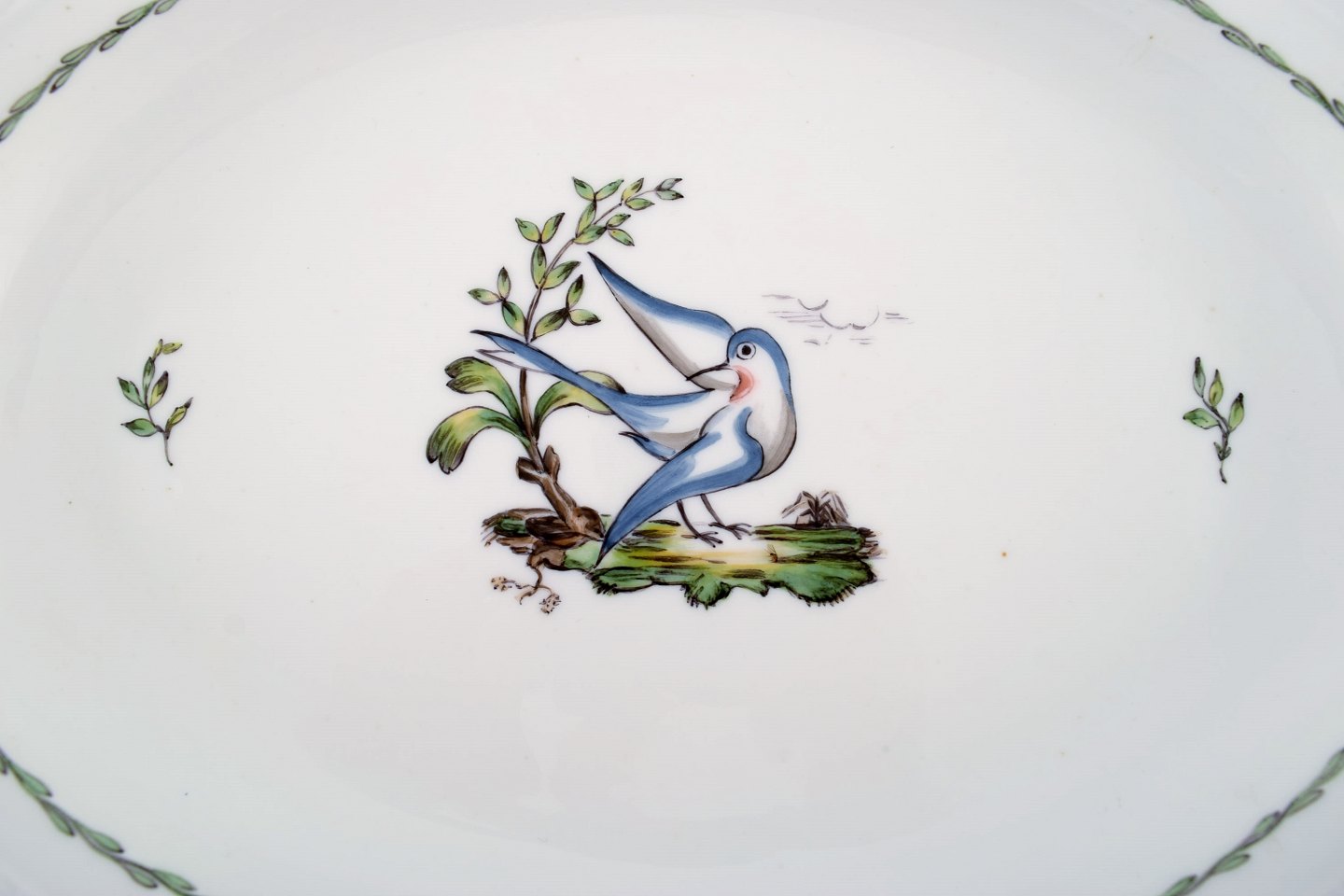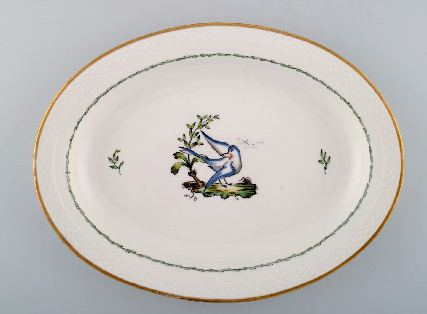 To store ovale Royal Copenhagen serveringsfade i håndmalet porcelæn med fuglemotiver og gulddekoration. Tidligt 1900-tallet.