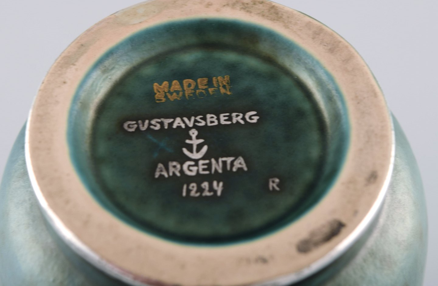 Wilhelm Kåge for Gustavsberg. Sjælden argenta art deco vase i glaseret keramik dekoreret med fugle i sølvindlæg. Sverige 1940´erne. Måler: 25 x 10,5 cm. Stemplet Gustavsberg, Kåge. I perfekt stand.