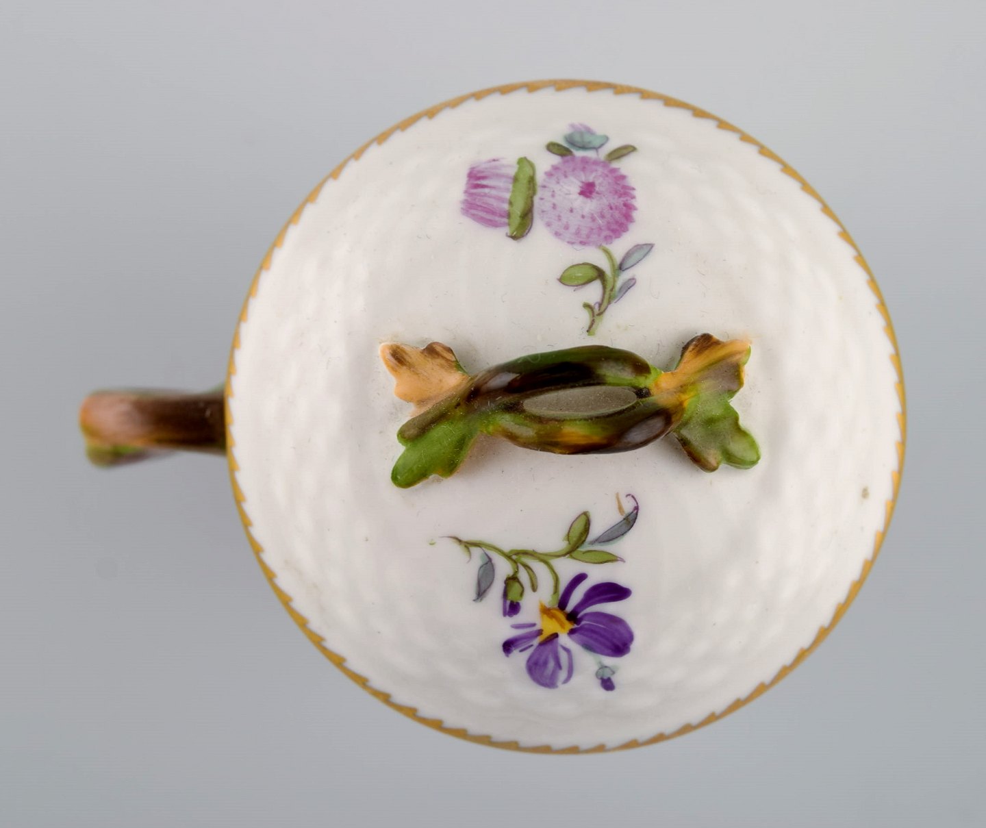 Royal Copenhagen Saksisk Blomst. Cremekop med underkop i håndmalet porcelæn. Modelnummer 1542. Tidligt 1900-tallet.