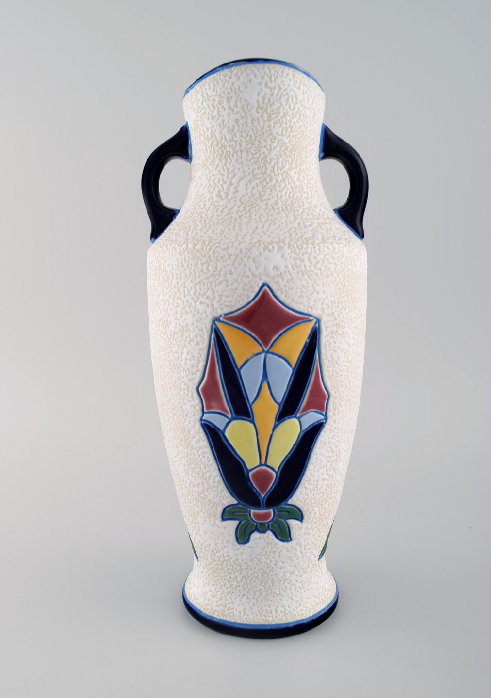Sjælden art deco Amphora vase i glaseret keramik med flamingoer. 1920/30'erne. Måler: 31,5 x 14 cm. I flot stand. Stemplet.
