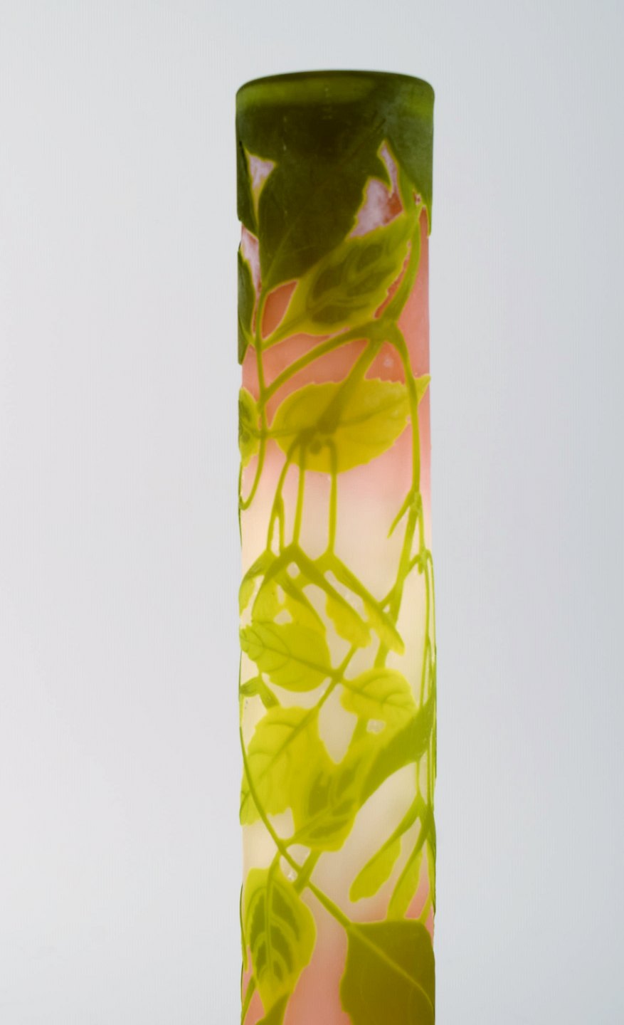 Tidlig Emile Gallé vase i matteret kunstglas med grønt overfang udskåret med motiver i form af bladværk. Ca. 1900. Måler: 33 x 12 cm. I flot stand. Signeret.