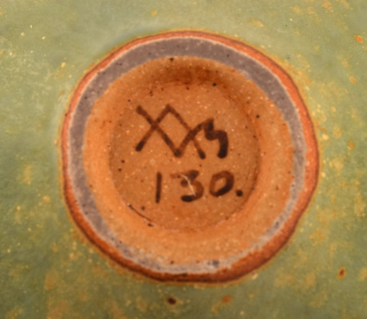 Arne Bang. Skål i glaseret keramik med bølget kant. Modelnummer 130. Smuk glasur i grønne nuancer. 1940/50'erne. I flot stand. Signeret. Måler: 18 x 4,5 cm.