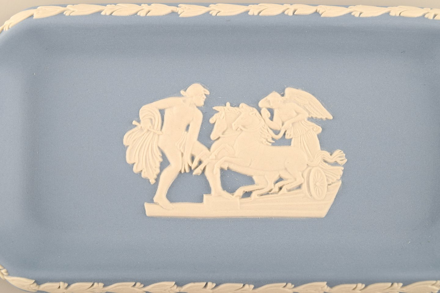 Wedgwood, England. Lille firkantet fad i lyseblåt stentøj med klassicistiske scener i hvidt. Ca. 1930.