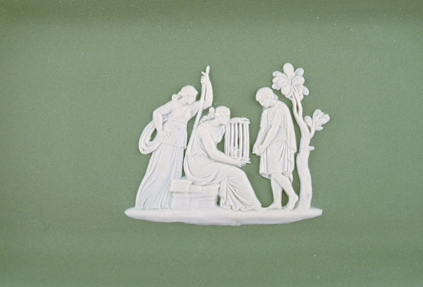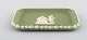 Wedgwood, England. Lille firkantet fad i grønt stentøj med klassicistiske scener i hvidt. Ca. 1930. Måler: 16 x 8,5 cm. Stemplet. I flot stand.