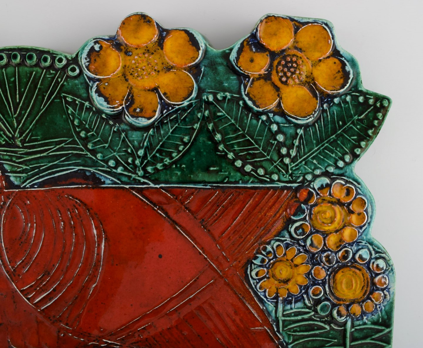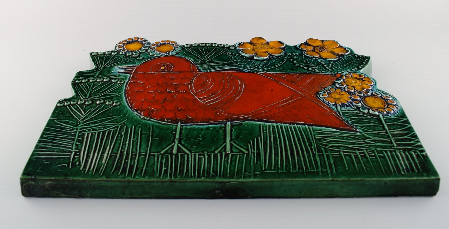 Lisa Larson for Gustavsberg. Stor og sjælden vægdekoration. Rød fugl på grøn baggrund. 1960'erne. I flot stand. Stemplet. Måler: 42 x 31,5 cm.