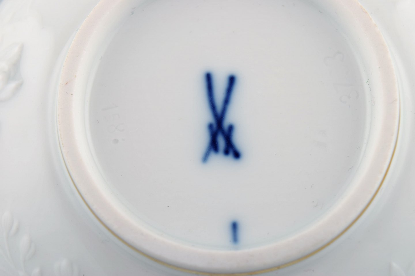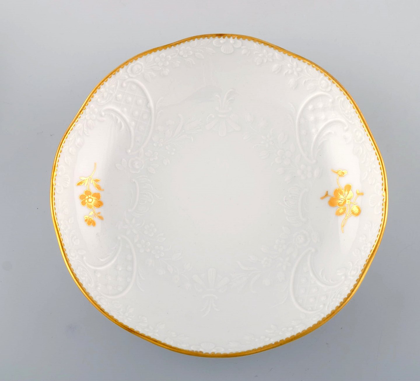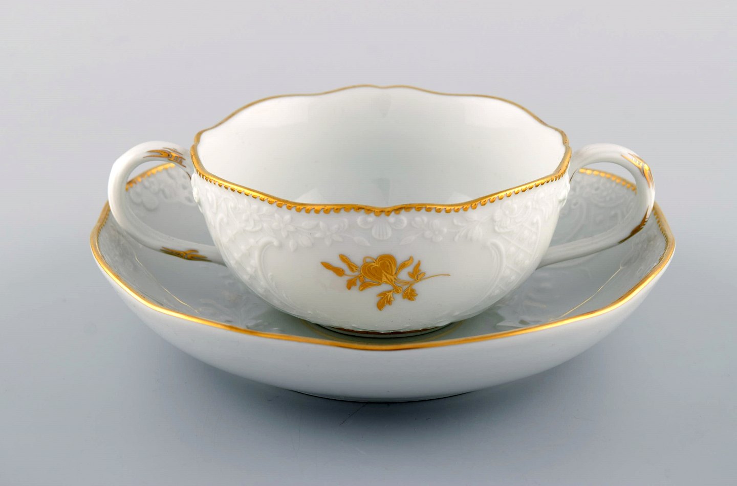 Seks Meissen boullionkopper med underkopper i porcelæn med blomster og bladværk i relief og gulddekoration. 1900-tallet.