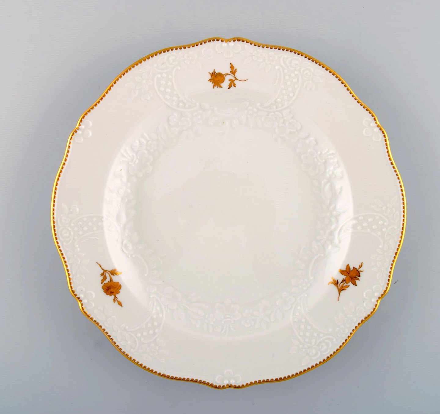 12 Meissen middagstallerkener i porcelæn med blomster og bladværk i relief og gulddekoration. 1900-tallet. Diameter: 24,5 cm. I flot stand. Stemplet. 1. Sortering.
