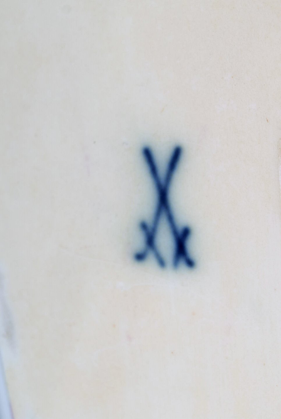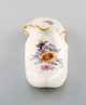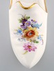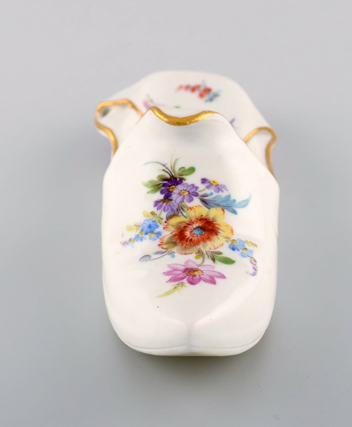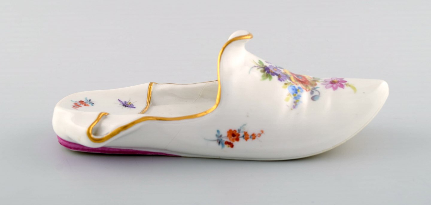 Antik Meissen slipper i håndmalet porcelæn med blomstermotiver og guldkant. 1800-tallet.