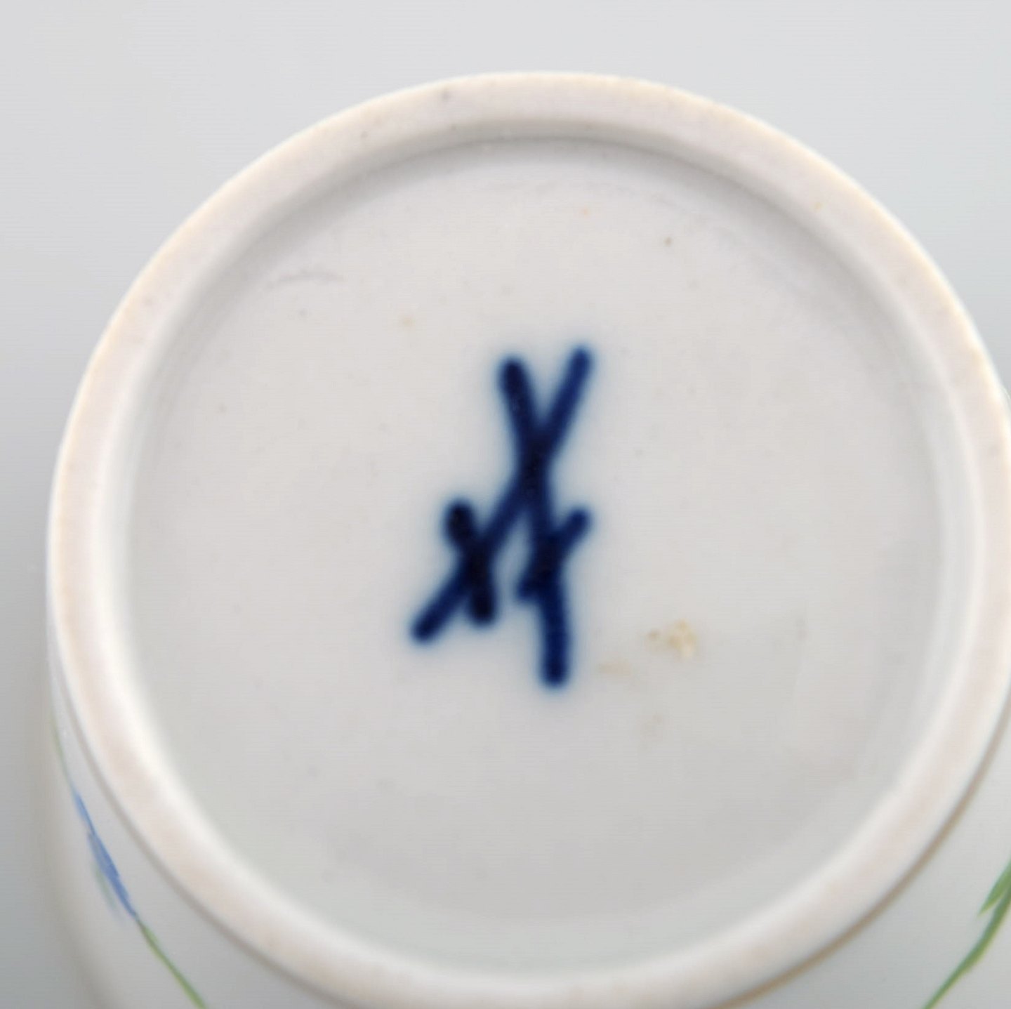 Lille Meissen bæger i håndmalet porcelæn med blomster. 1900-tallet. Måler: 4,4 x 4,3 cm. I flot stand. Stemplet. 1. Sortering.