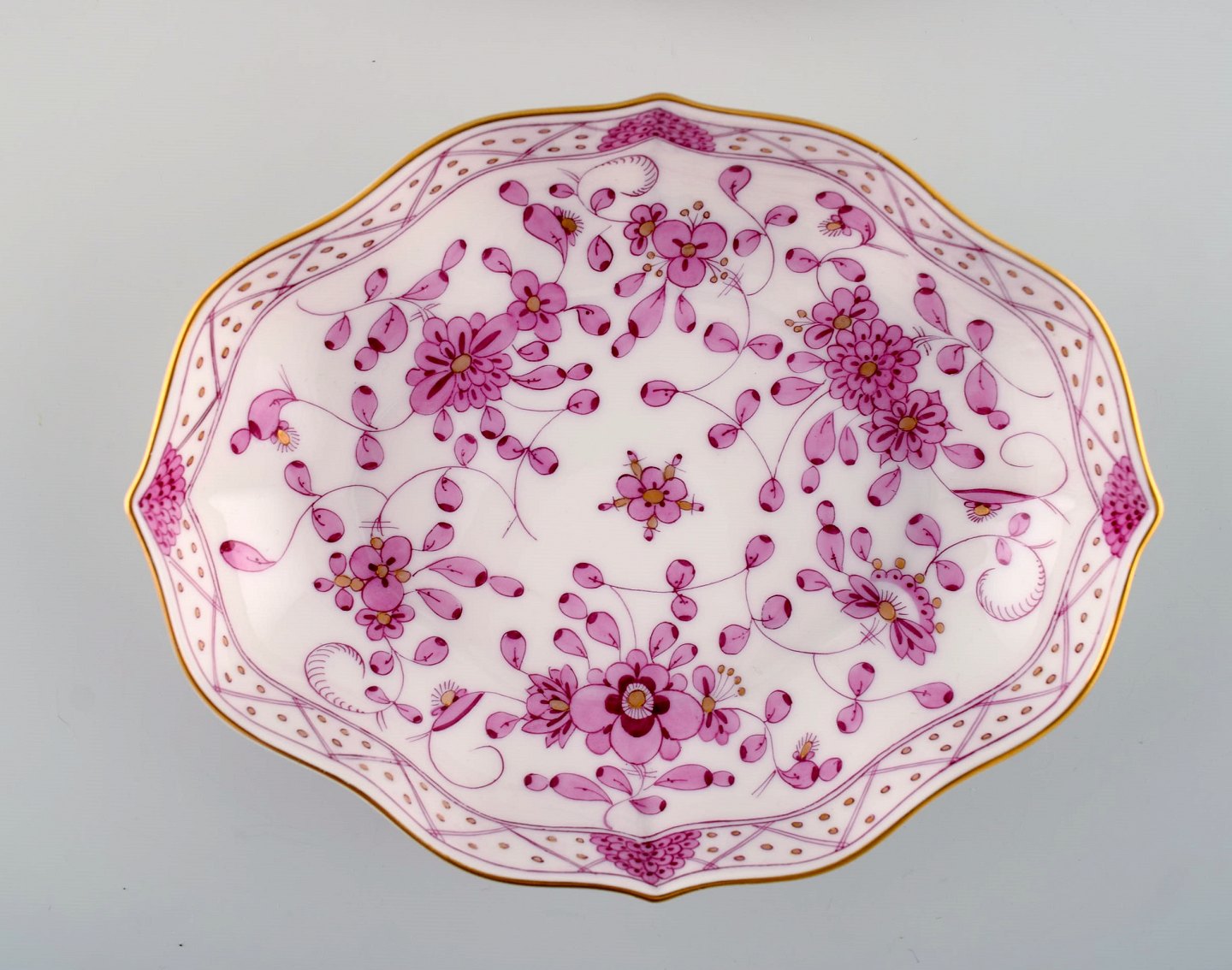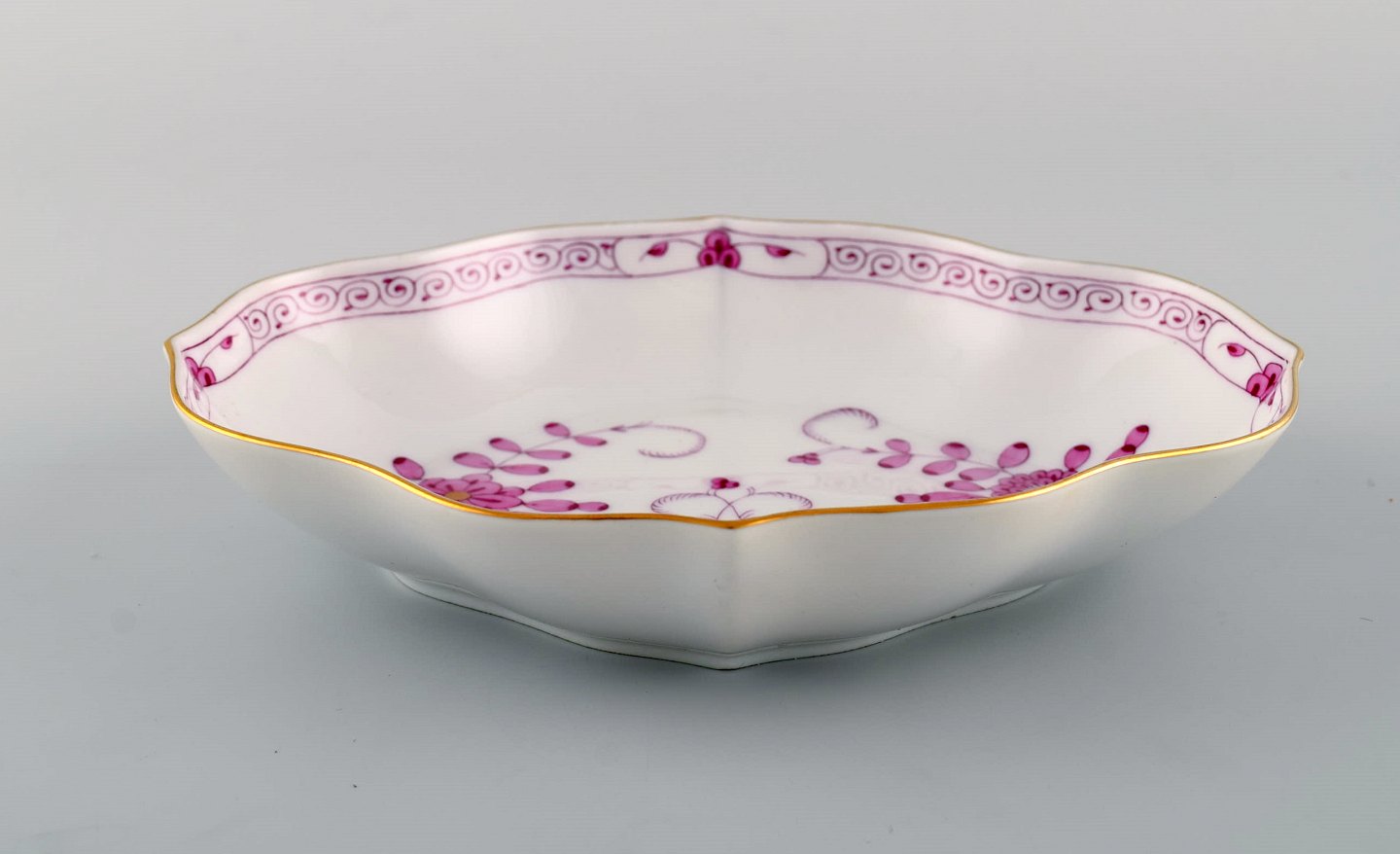 Three Meissen Pink Indian bowls in hand-painted porcelain with pink floral motifs. 20th century. Largest measures: 18.5 x 15 x 3.5 cm. 1st and 3rd factory quality. In very good condition. Stamped.