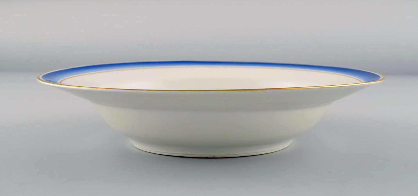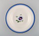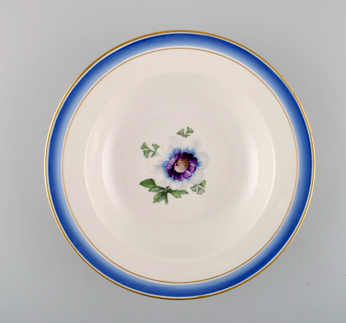 Fem antikke Royal Copenhagen dybe tallerkener i håndmalet porcelæn med blomster og blå kant med guld. Modelnummer 592/9049. Sent 1800-tallet.
