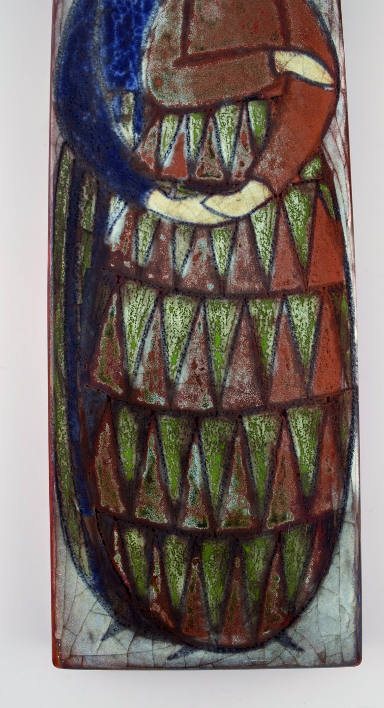 Michael Andersen, Bornholm. Stor vægplakette i glaseret keramik med ungt par. Smuk krakkeleret glasur. 1950'erne. Måler: 43 x 14,5 cm. I flot stand. Stemplet.