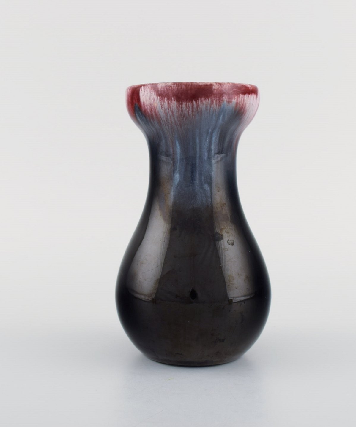 Michael Andersen, Bornholm. To vaser i glaseret keramik. Smuk glasur i røde og mørke nuancer. 1950'erne. Største måler: 15,3 x 9 cm. I flot stand.