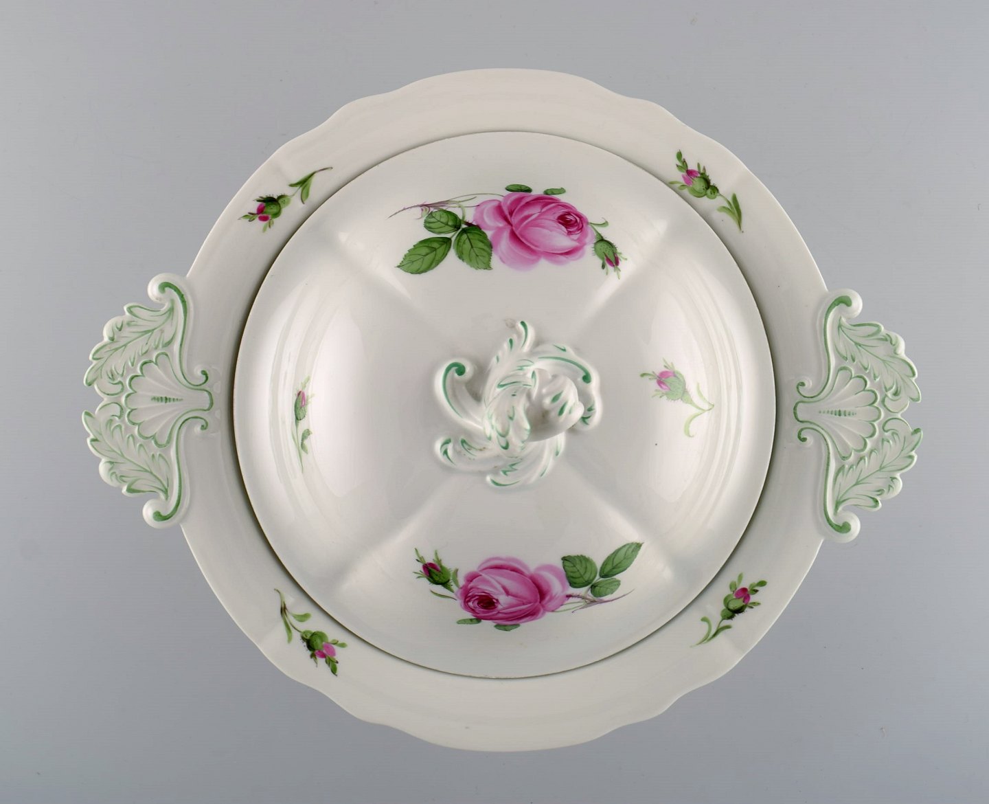 Stor antik Meissen lågterrin i håndmalet porcelæn med lyserøde roser. Tidligt 1900-tallet. Måler: 34 x 18,5 cm. I flot stand. Stemplet. 2. Sortering.
