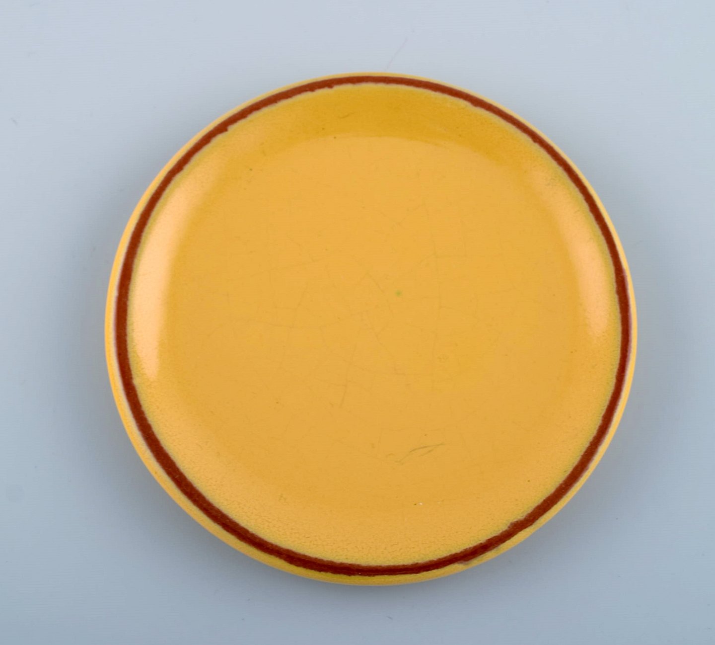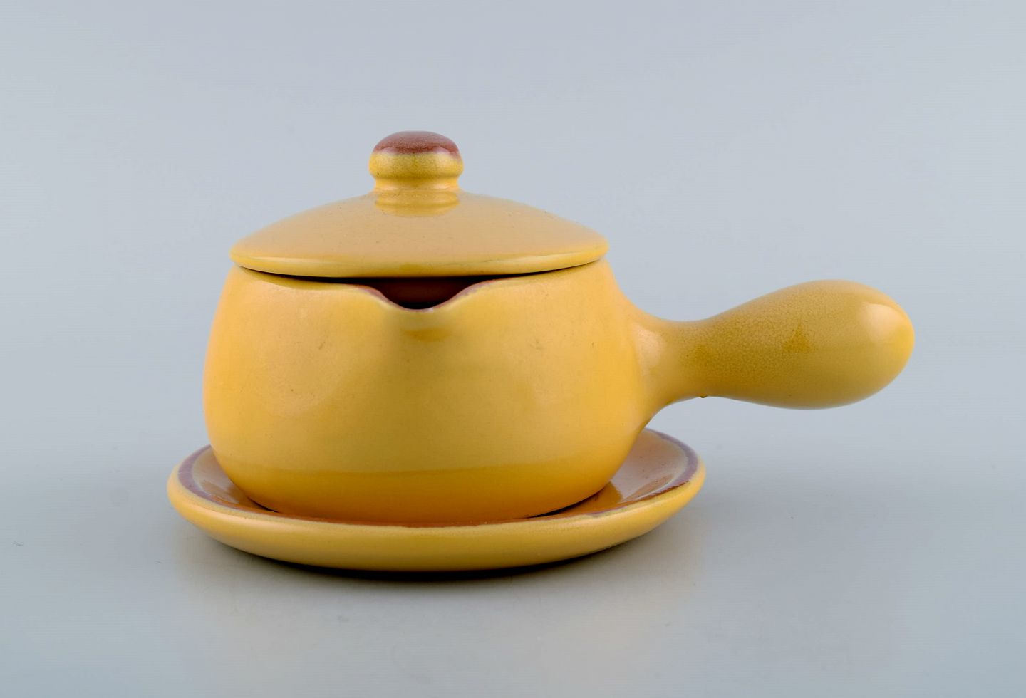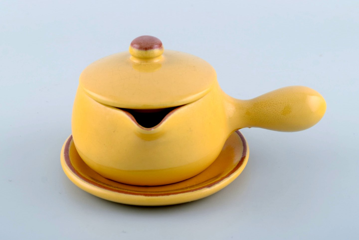 Vicke Lindstrand for Upsala Ekeby. Sovsekande på underfad i glaseret stentøj. Smuk gul glasur. 1950'erne. Måler: 16,5 x 8,5 cm. Stemplet. I flot stand.