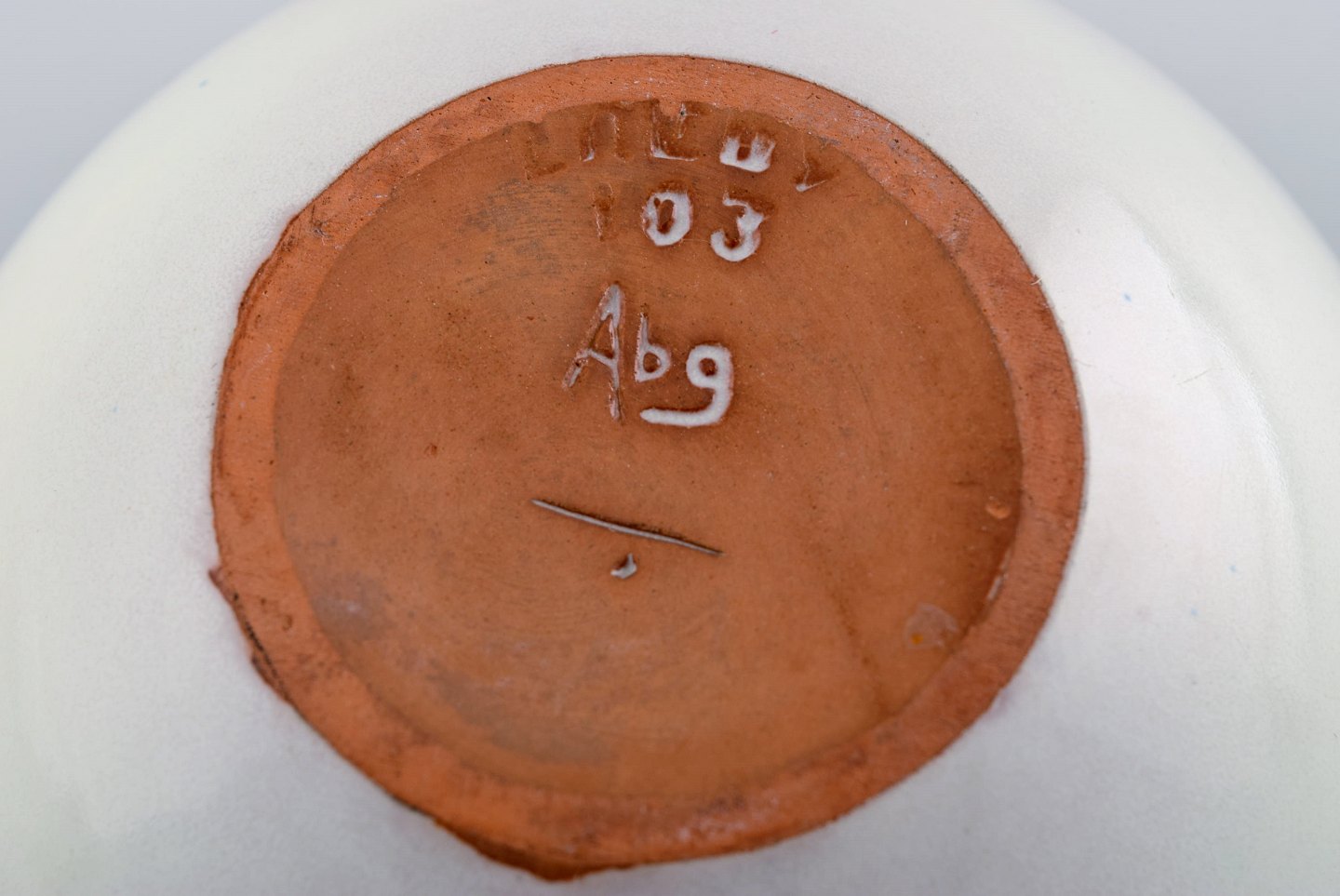 Ingrid Atterberg for Upsala Ekeby. Skål i glaseret stentøj. Stribet design i blå og hvide nuancer. Dateret 1947-53.