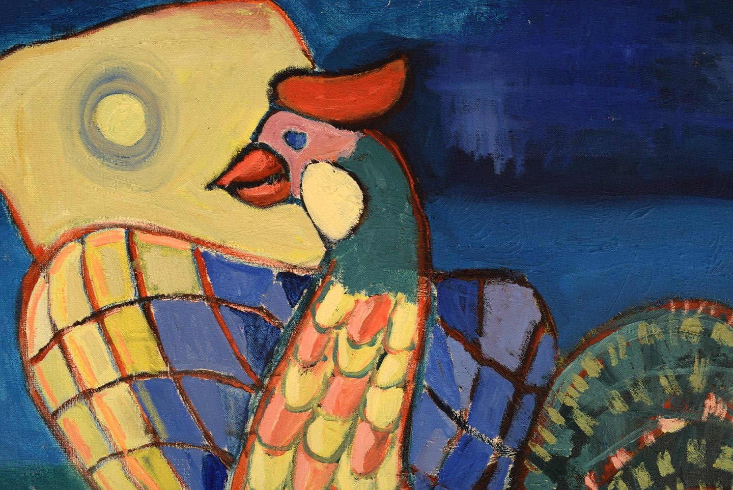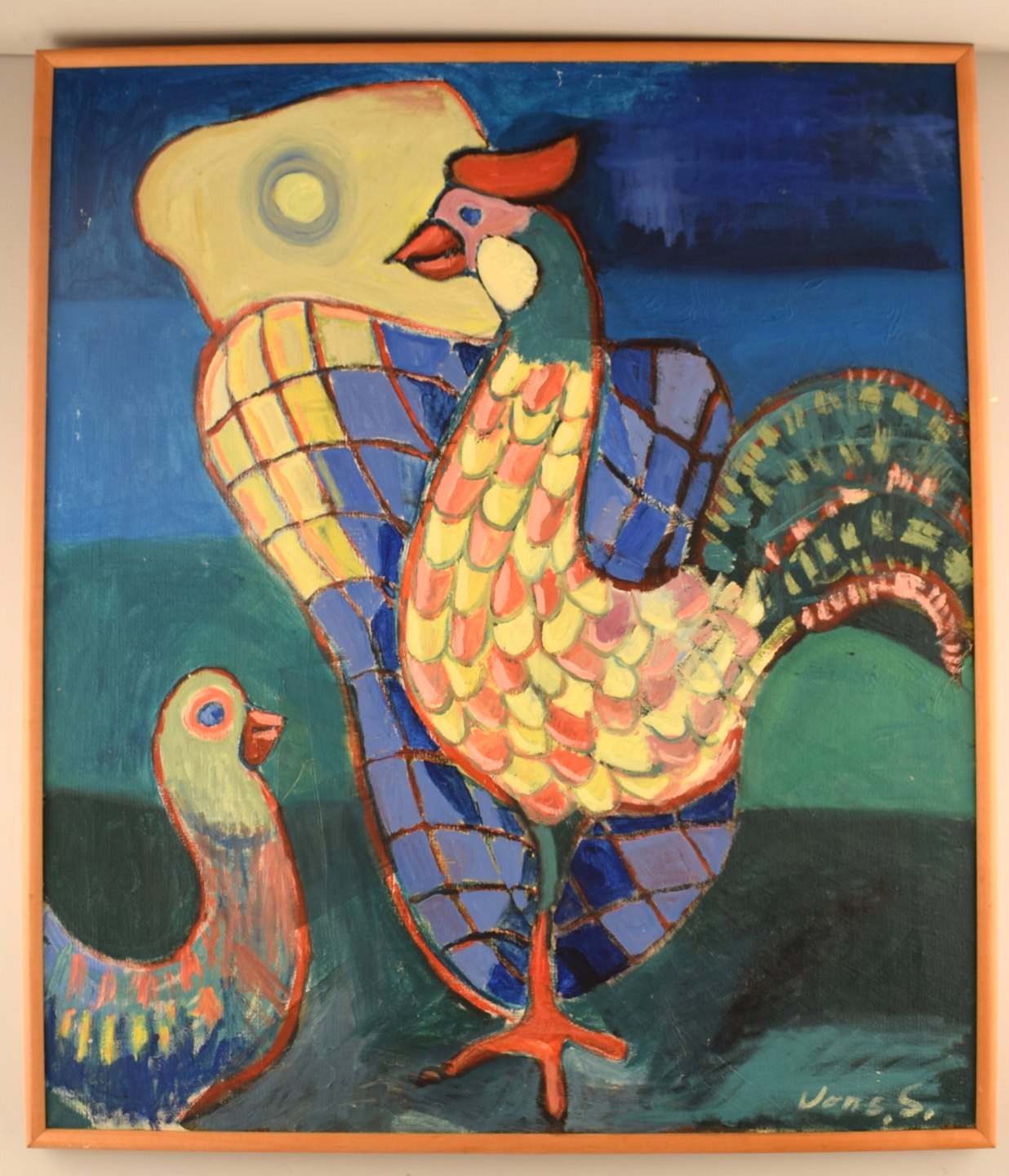 Dansk kunstner. Olie på lærred. "Hane og kylling". Midt 1900-tallet. Lærredet måler: 74 x 64,5 cm. Rammen måler: 1,5 cm. I flot stand. Signeret.