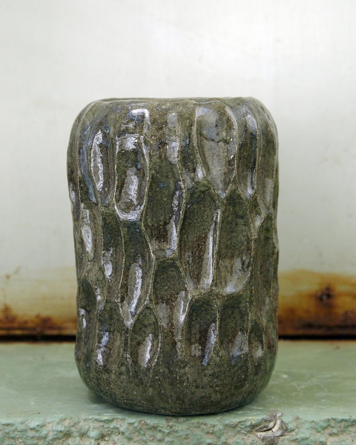 Christina Muff, dansk samtidskeramiker (f. 1971). Unikavase af gråt stentøjsler, lavaler, med udskæringer. Transparent, blank glasur med blå nuancer, som mineraler i jorden. En del af ‘soil’ serien.
