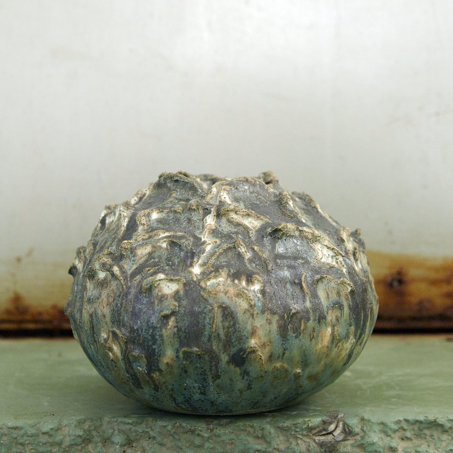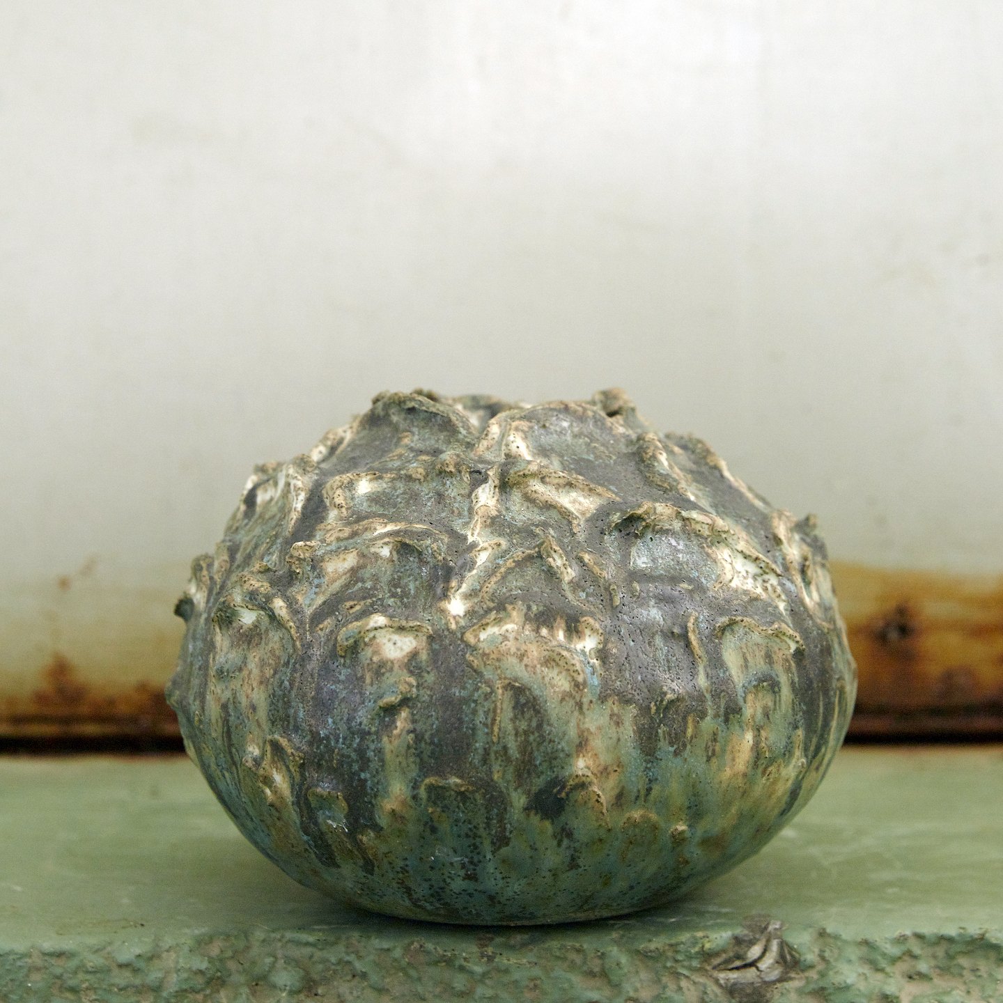 Christina Muff, dansk samtidskeramiker (f. 1971). Vase af stentøjsler hånddekoreret med forskellige lertyper. Glaseret i matte glasurer i farverne cremehvid, mørk grøn og sortgrå. Unika, en del af ‘Seed’ serien.