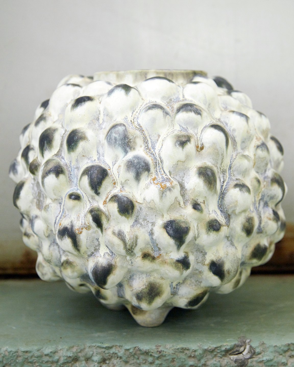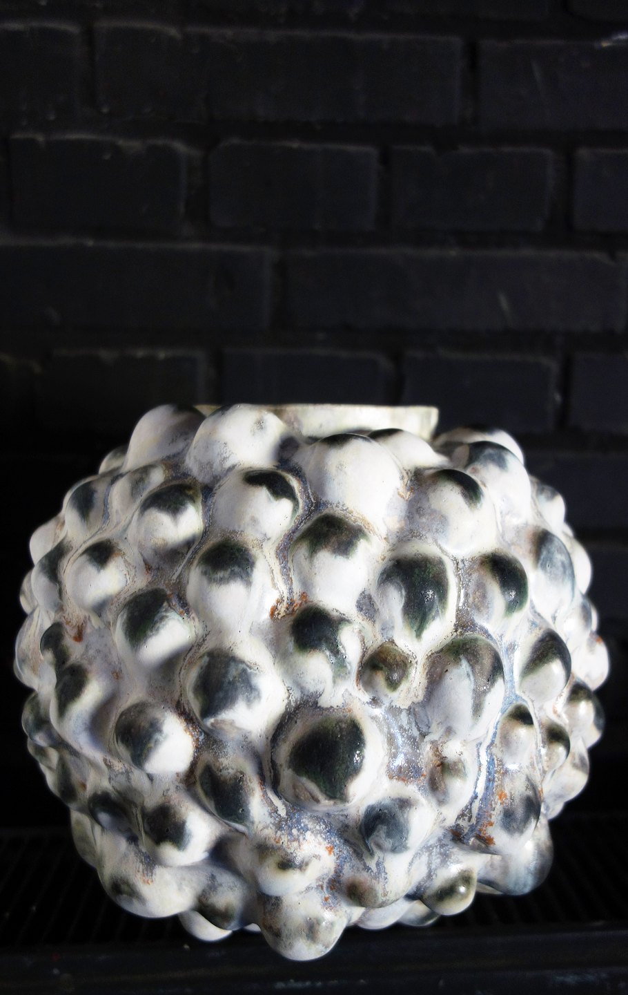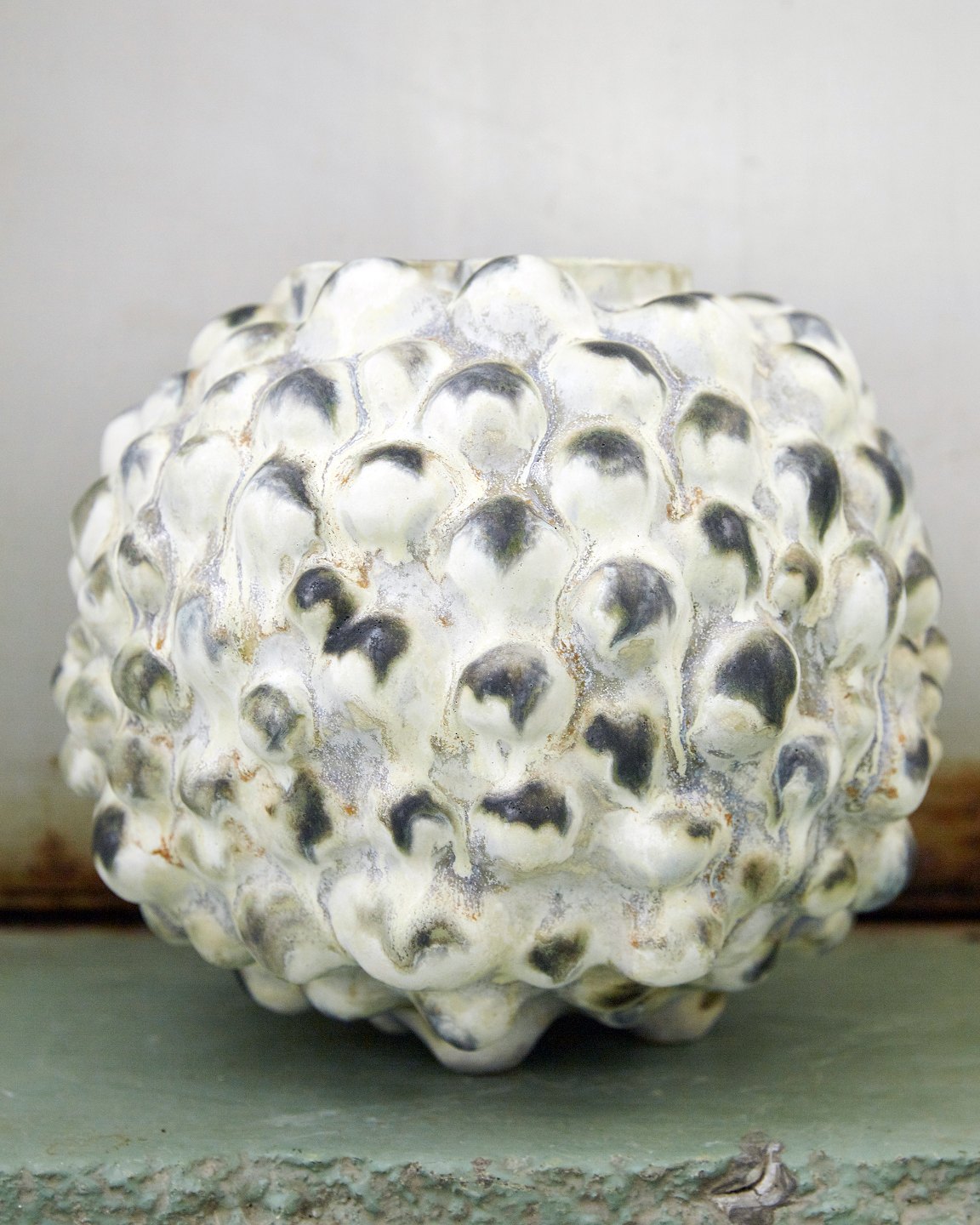 Christina Muff, dansk samtidskeramiker (f. 1971). Stor, rund skulpturel unikavase. Basen på denne vase er en kridhvid, mat glasur og på alle toppene er der en grønsort løbeglasur. Imellem kan man finde både orange og blå glasurløbere. Denne skulptur er en del af 'Salt' serien af Christina Muff.