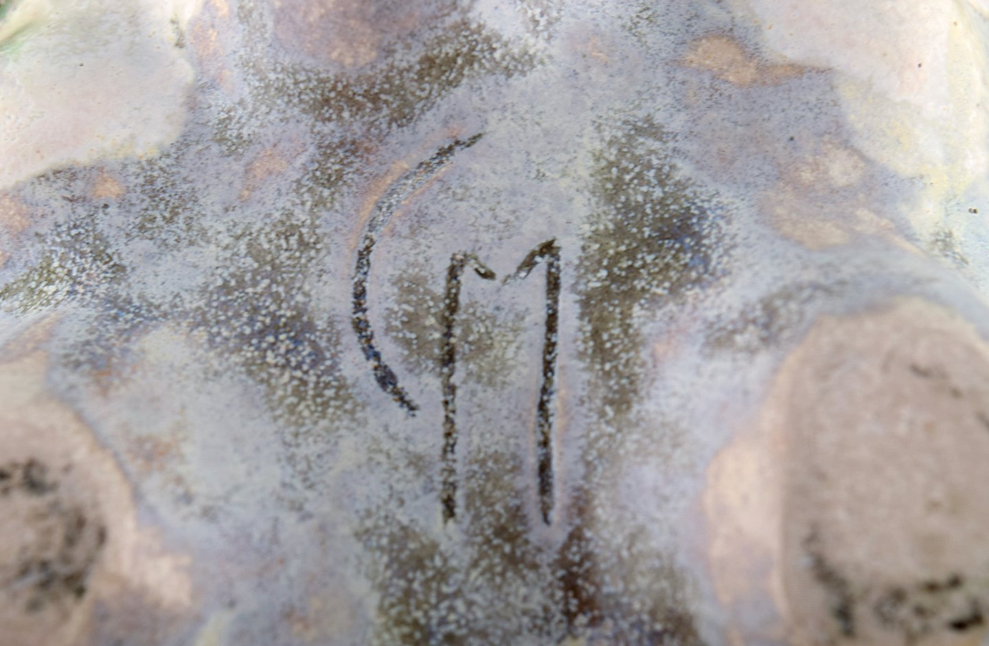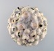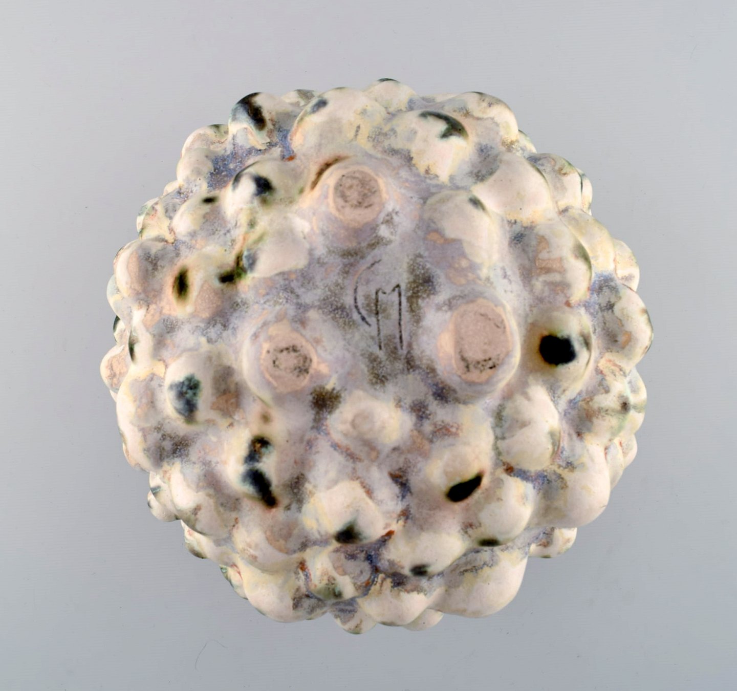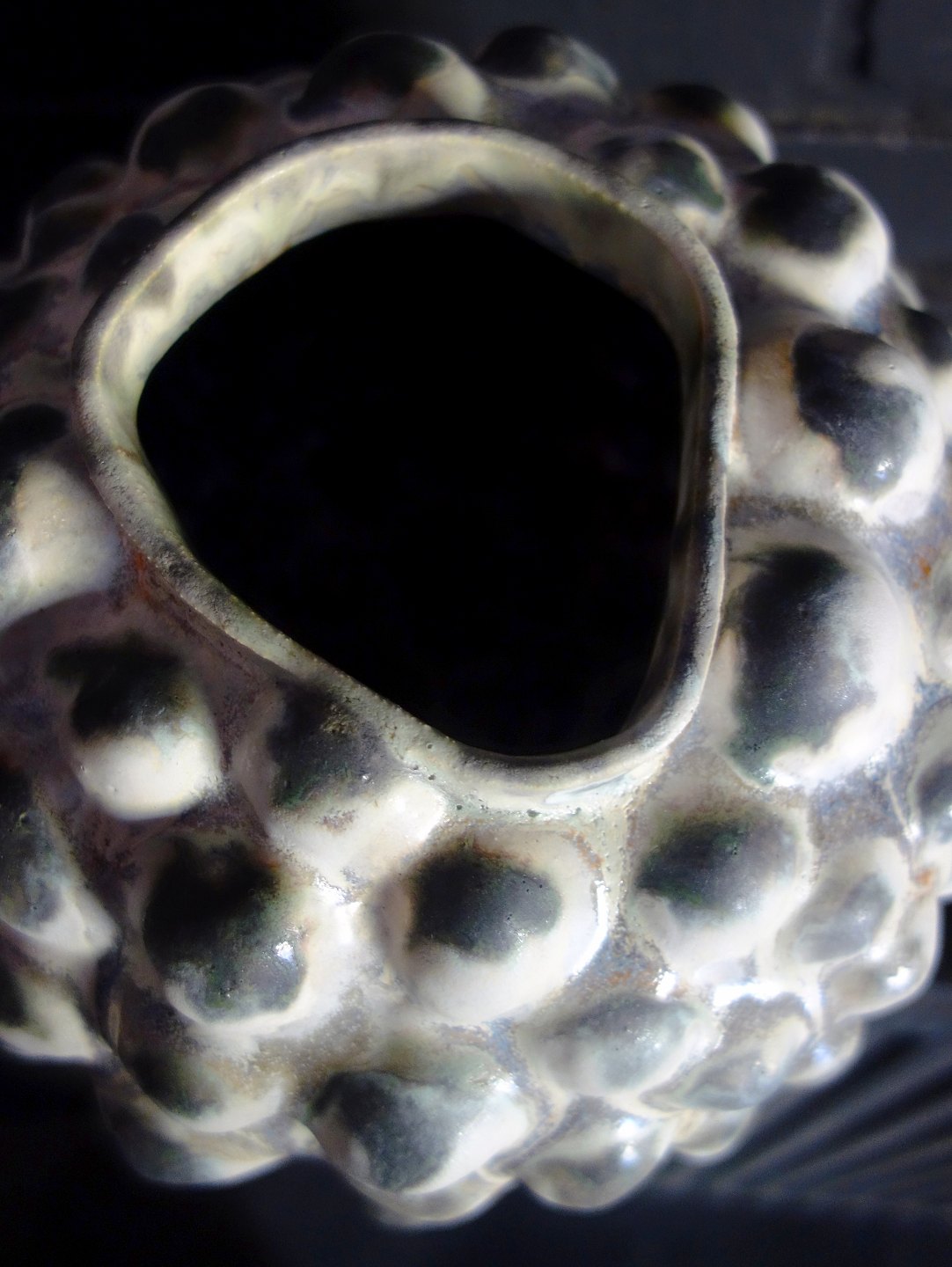 Christina Muff, dansk samtidskeramiker (f. 1971). Stor, rund skulpturel unikavase. Basen på denne vase er en kridhvid, mat glasur og på alle toppene er der en grønsort løbeglasur. Imellem kan man finde både orange og blå glasurløbere. Denne skulptur er en del af 'Salt' serien af Christina Muff.