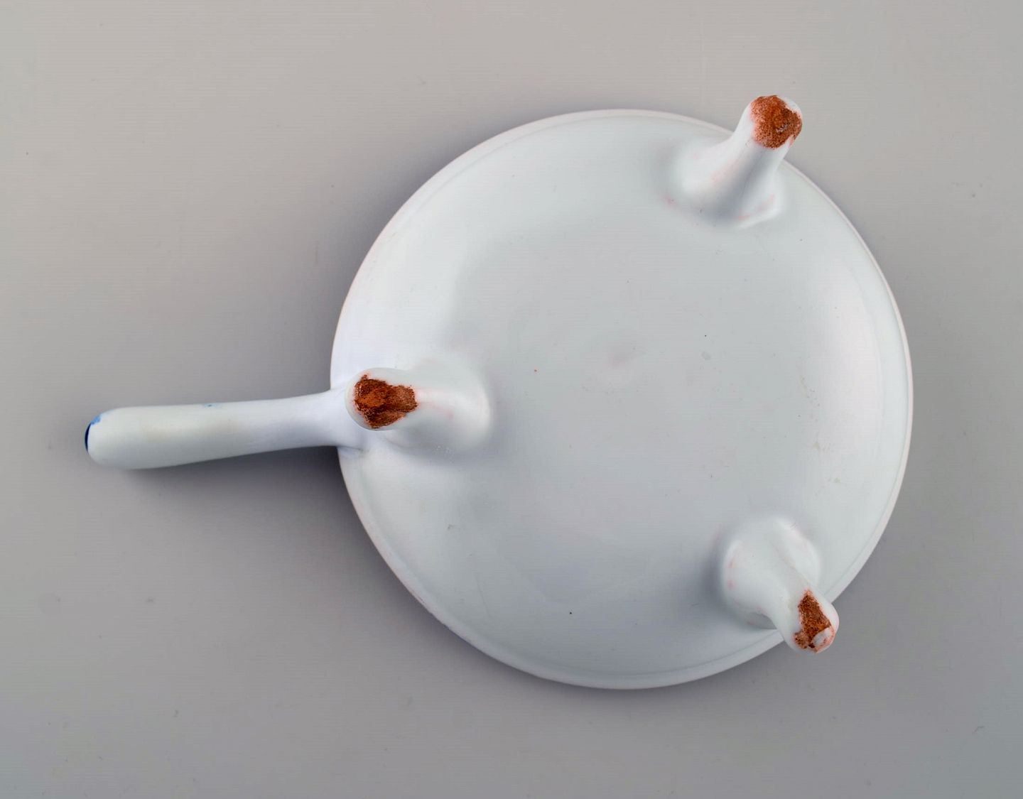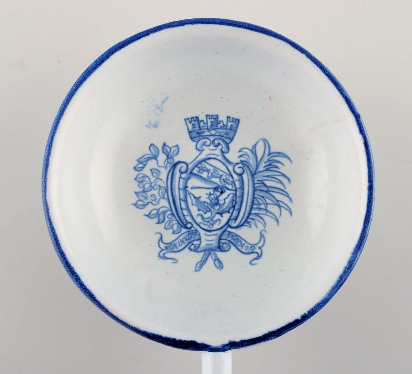 Emile Gallé for St. Clement, Nancy. Antik skål med hank på trefod i håndmalet fajance med våbenskjold. 1870/80'erne.
