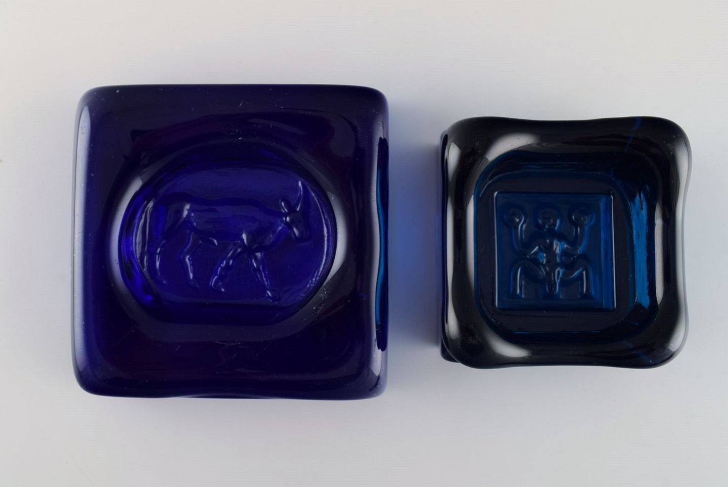 Erik Höglund (1932-1998) for Kosta Boda. Four low bowls in blue mouth blown art glass. Swedish design 1960 / 70s. Largest measure: 10 x 10 x 3 cm. In excellent condition.