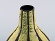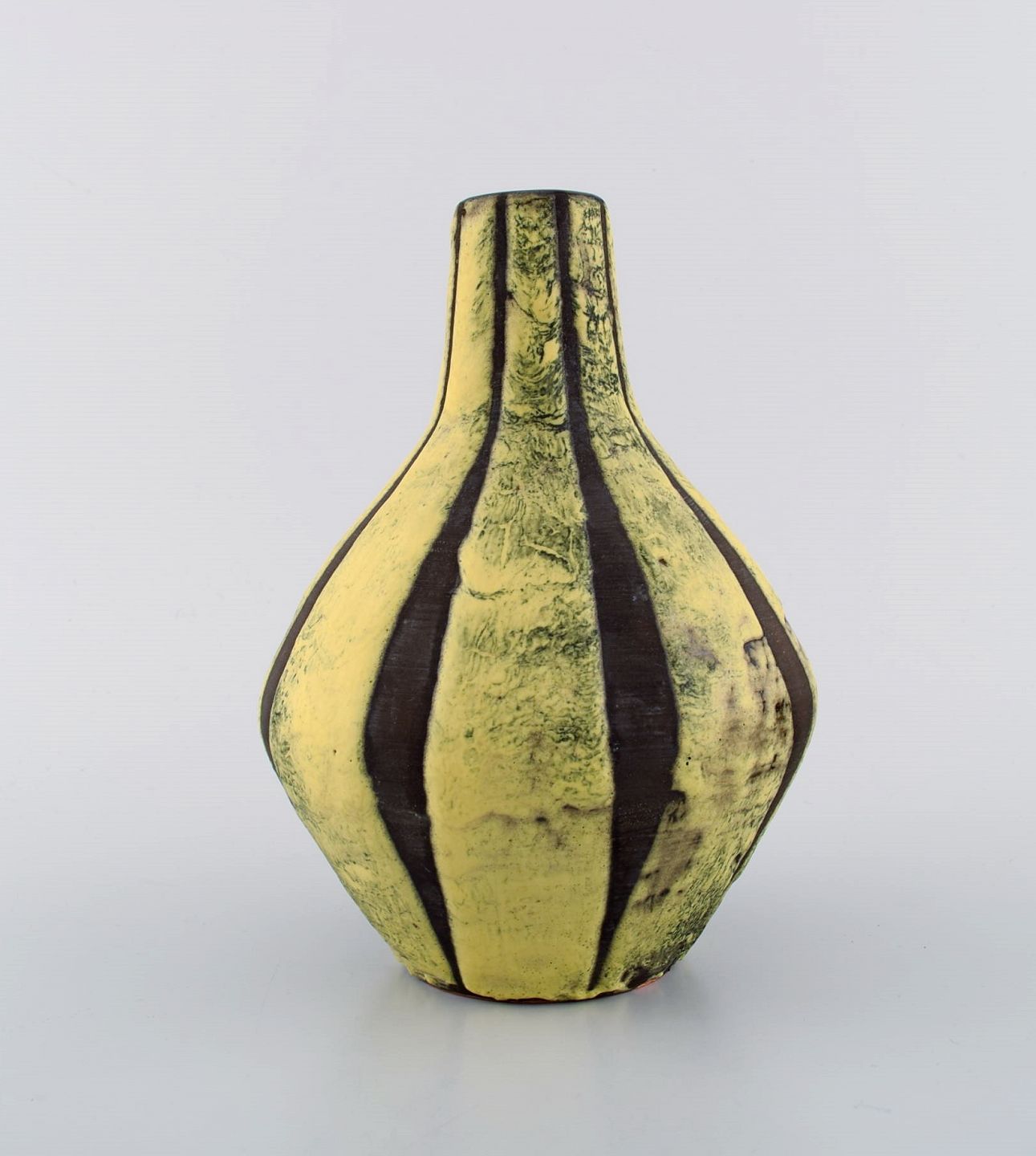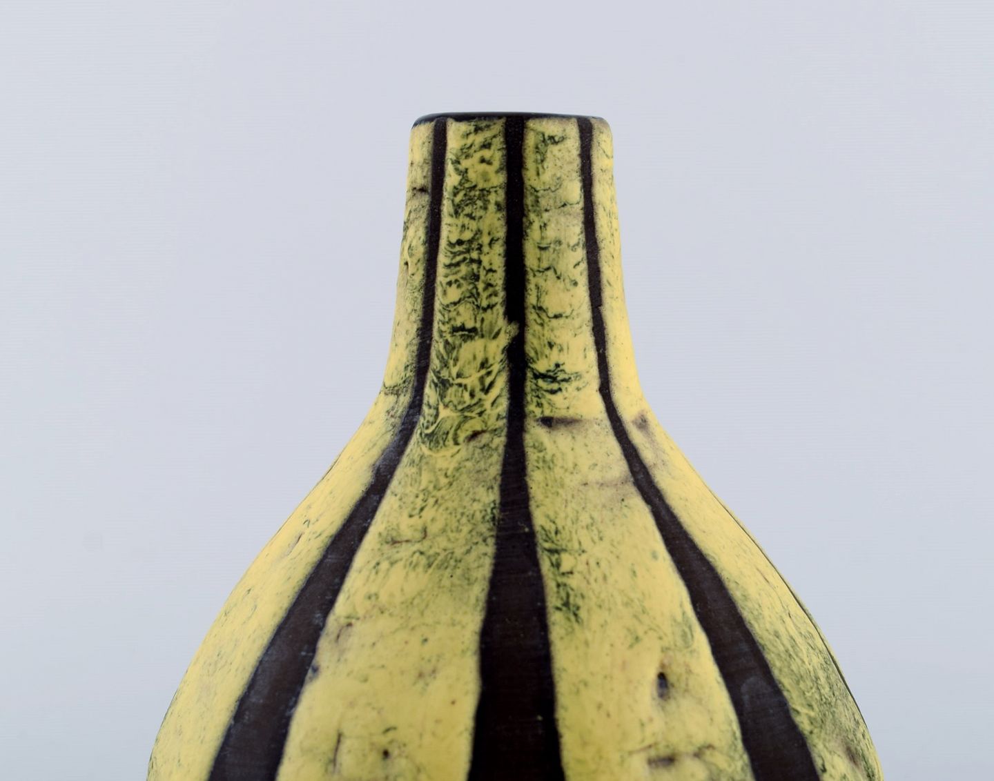 European studio ceramicist. Unique retro vase in glazed ceramics. Black / yellow striped design. 1960s. Measures: 20,5 x 14,5 cm. In excellent condition. Signed.