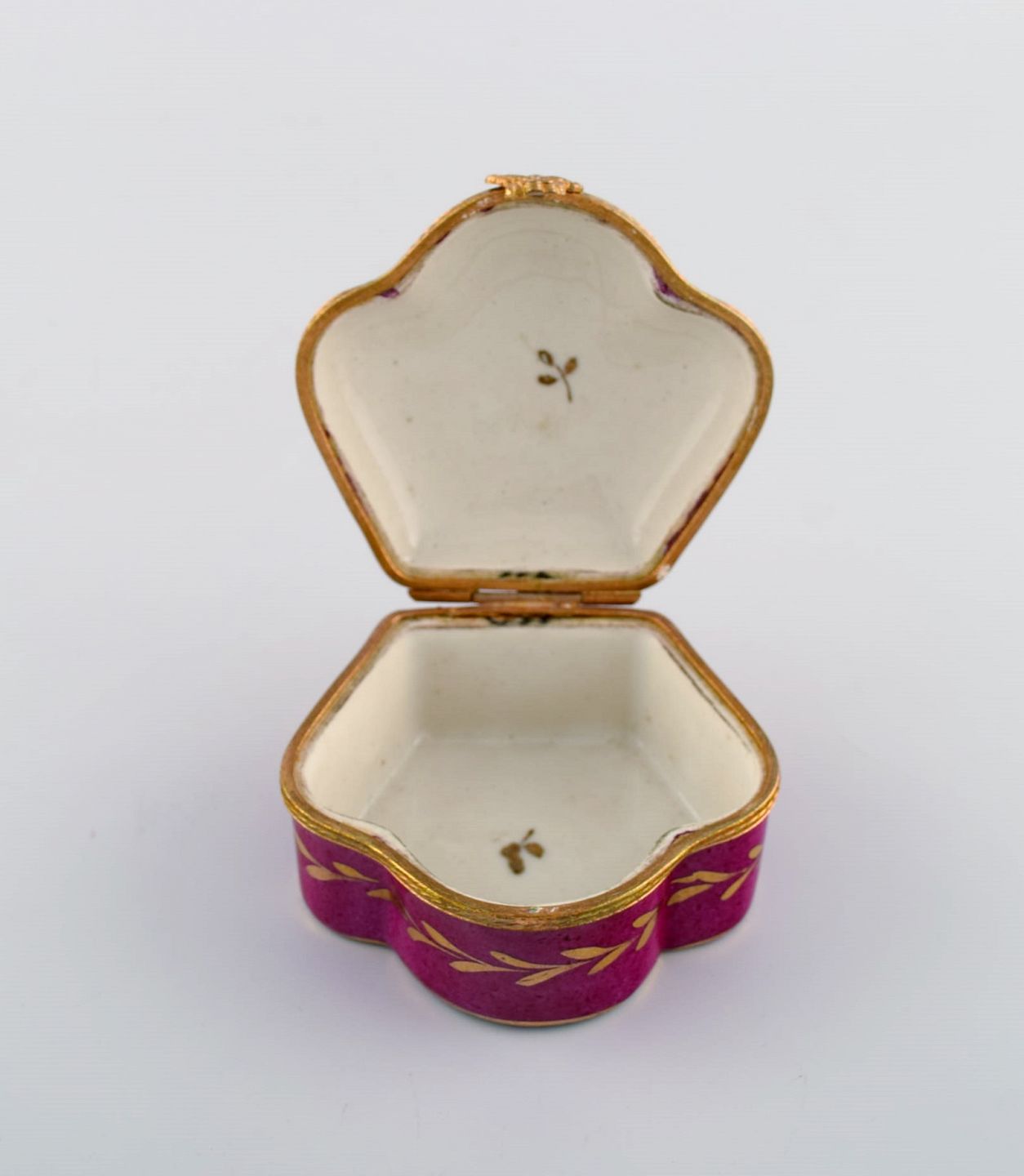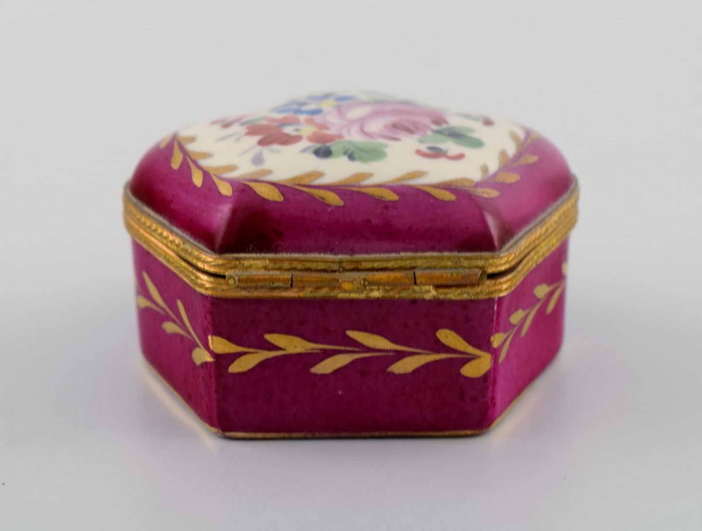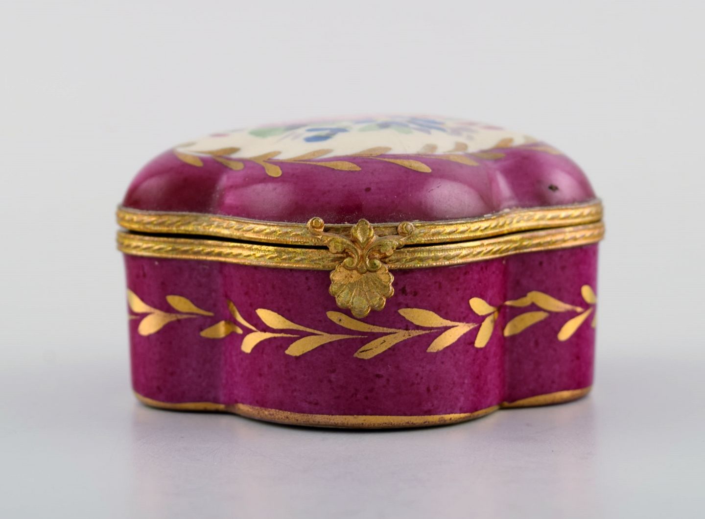 Antikt lågskrin i håndmalet porcelæn med blomster og gulddekoration på lilla baggrund. Sevres stil, tidligt 1900-tallet. Måler: 8 x 4,5 cm. I flot stand. Stemplet.