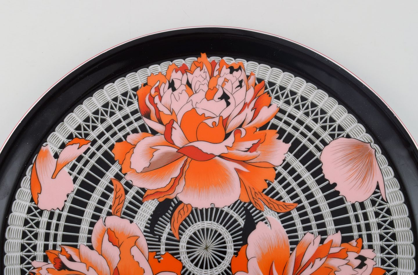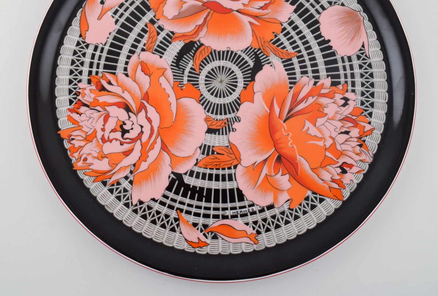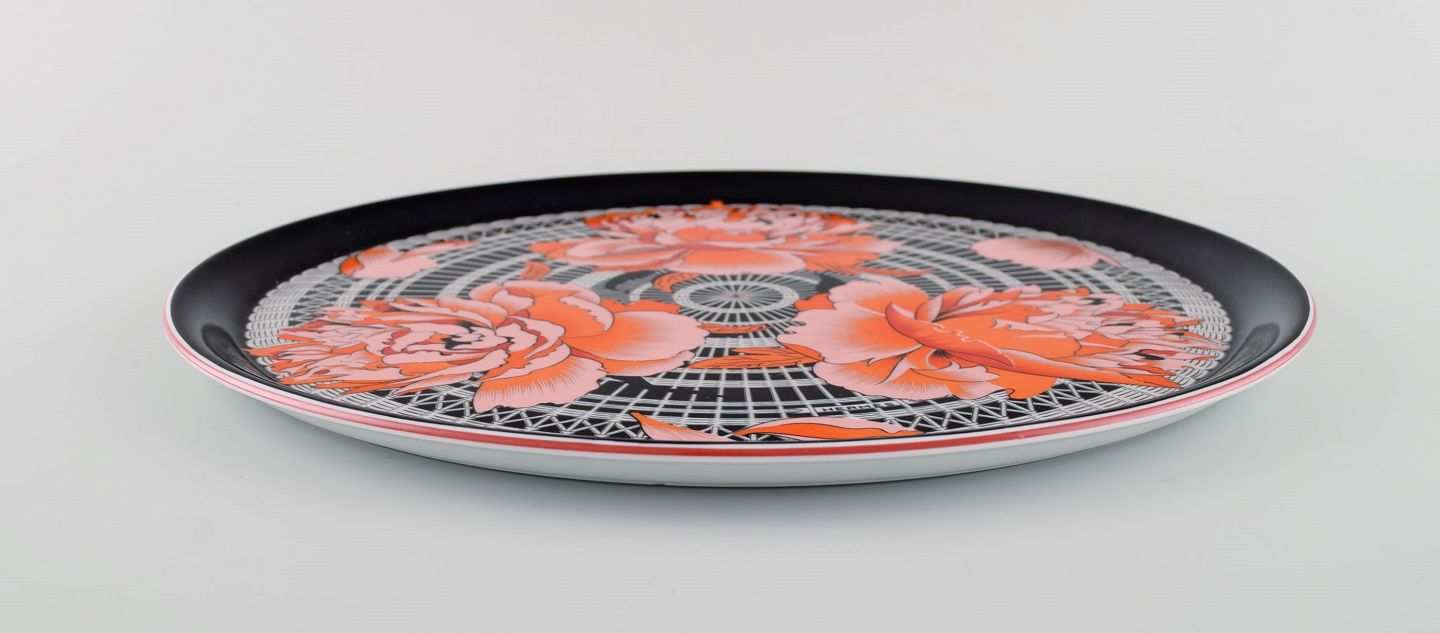 Stort rundt Hermès serveringsfad i porcelæn dekoreret med røde blomster på sort/hvid mønstret baggrund. 1980erne. Måler: 31 x 1,7 cm. I flot stand. Stemplet.