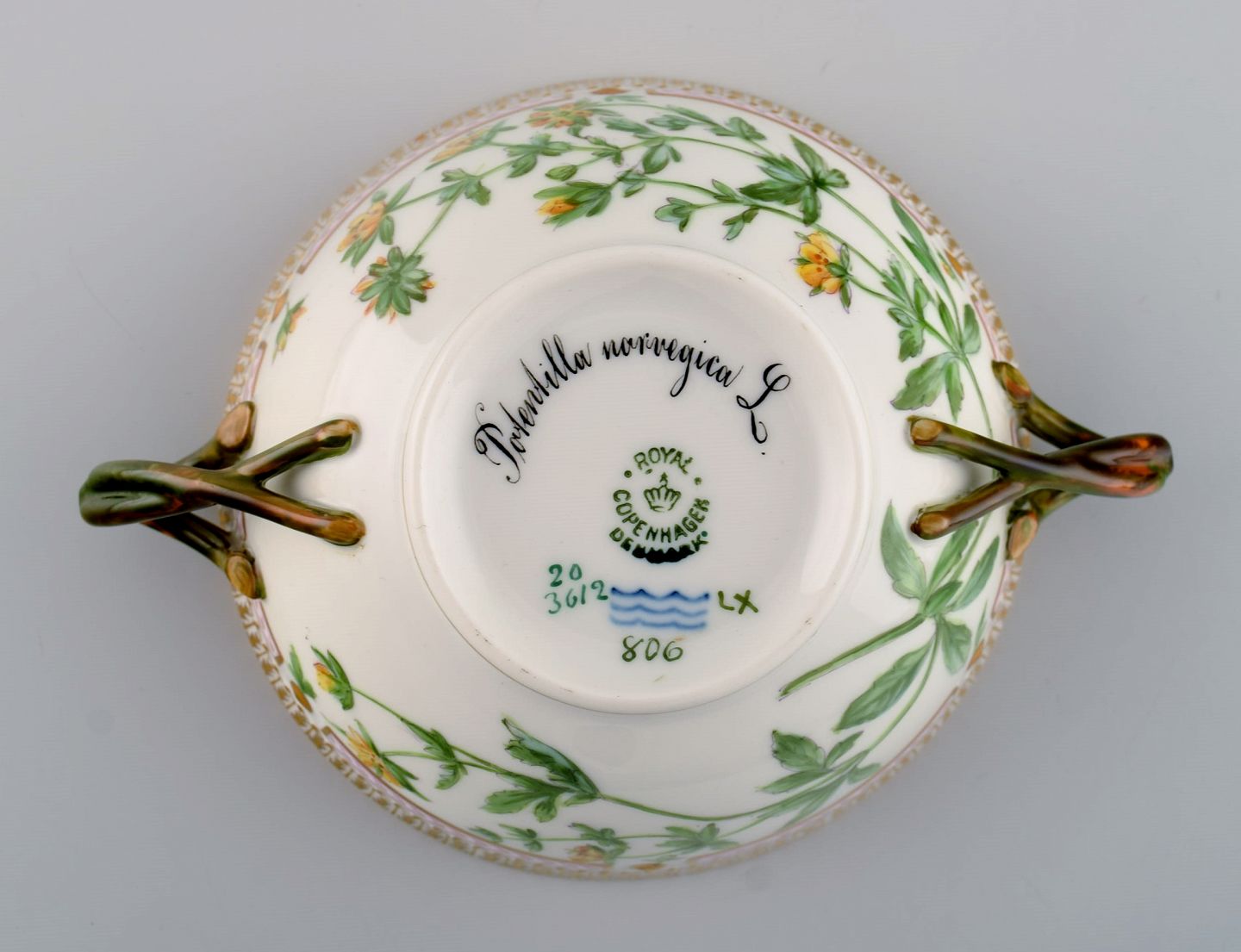 Royal Copenhagen Flora Danica boullionkop med underkop i håndmalet porcelæn med grenformede hanke, blomster og gulddekoration. Modelnummer 20/3612.