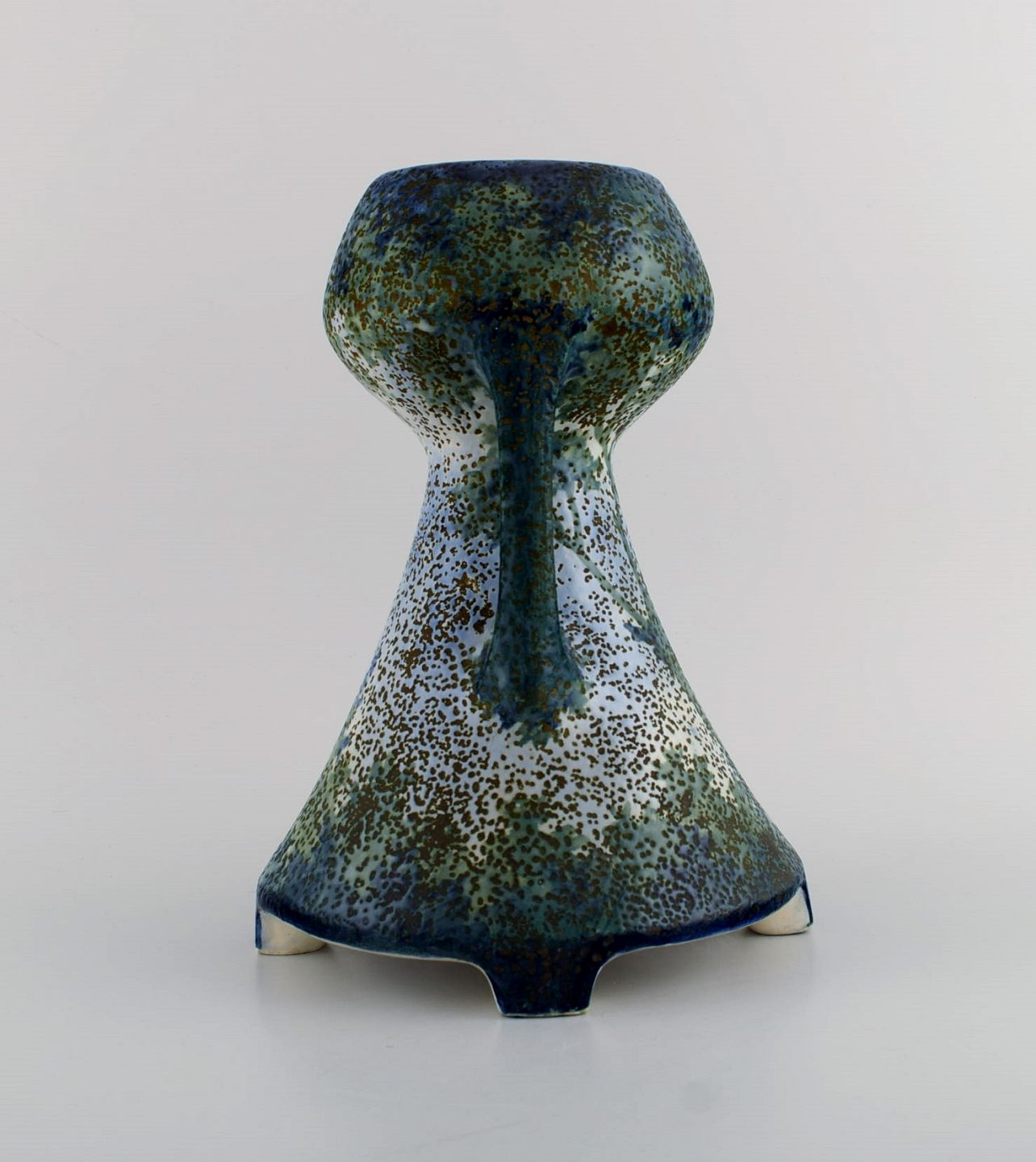 Fransk keramiker. Stor vase med hanke i glaseret keramik. Smuk glasur i blågrønne og hvide nuancer. 1930'erne.